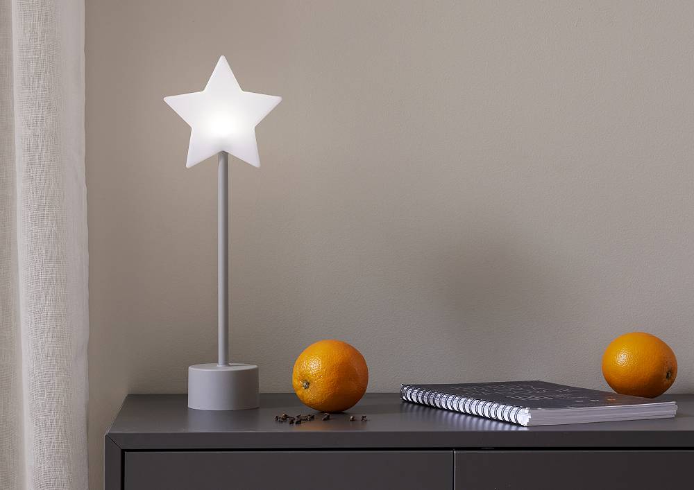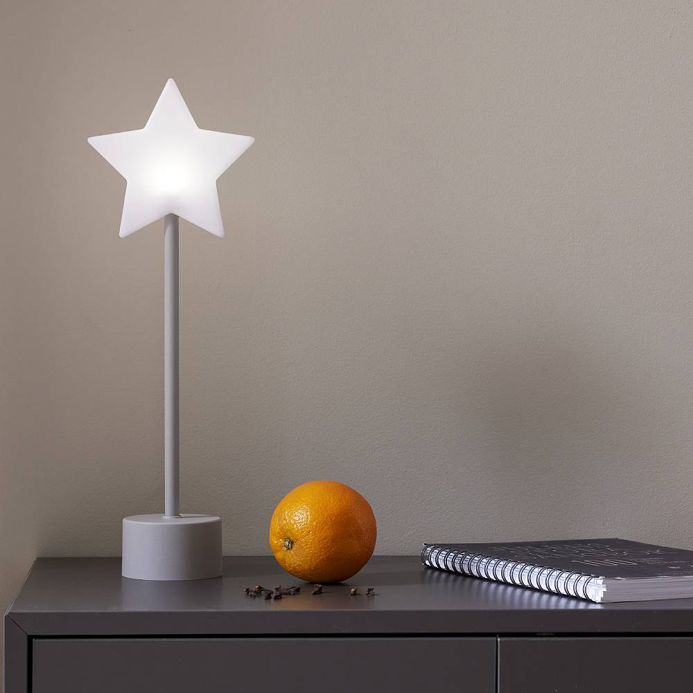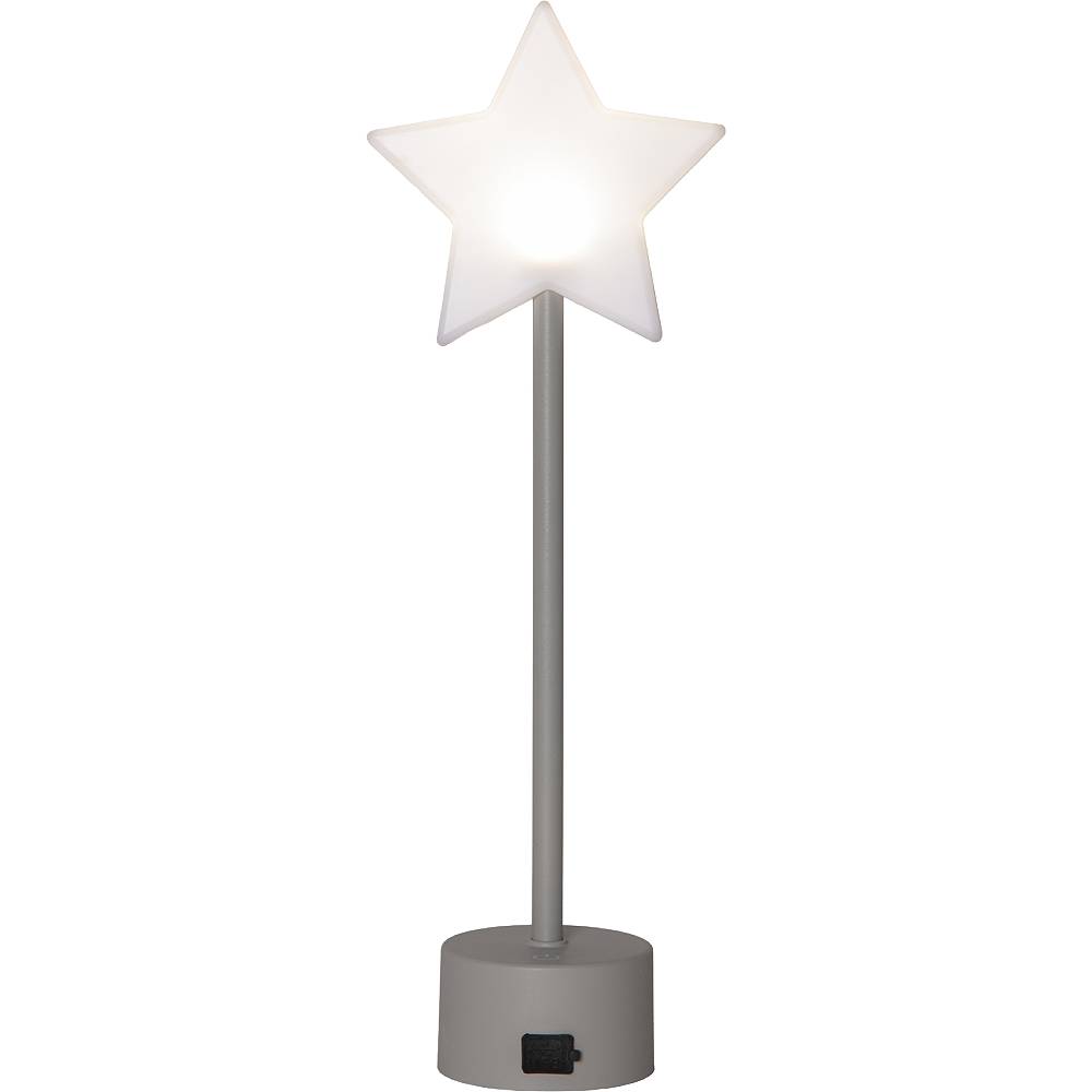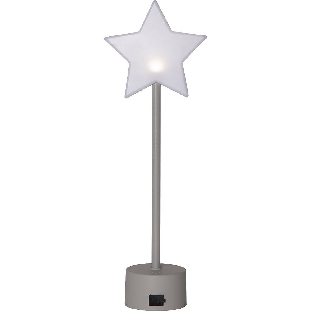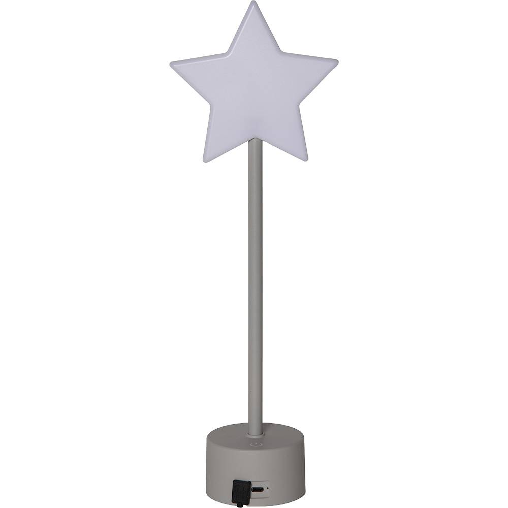 Liten lysande stjärna på en ljusgrå fot, drivs av ett uppladdningsbart batteri. Laddkabel med USB C plugg medföljer.