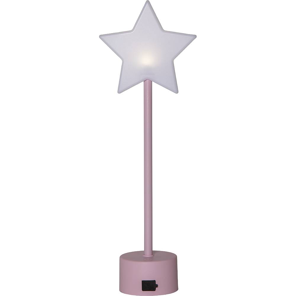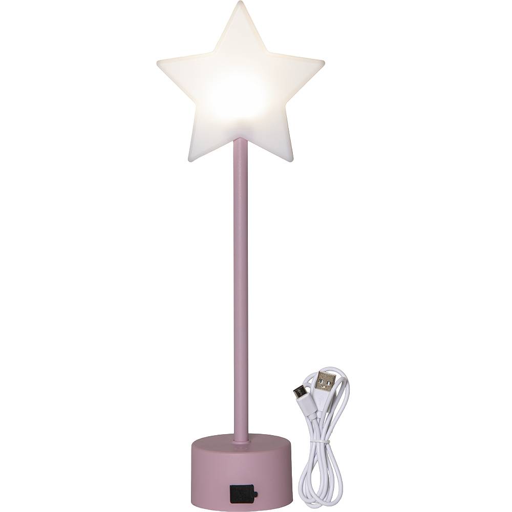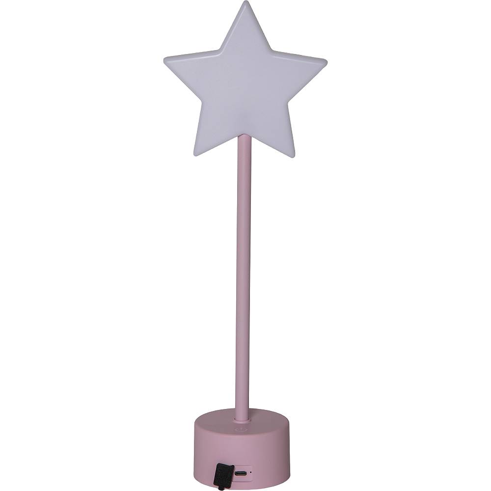 Liten lysande stjärna på en rosa fot, drivs av ett uppladdningsbart batteri. Laddkabel med USB C plugg medföljer.