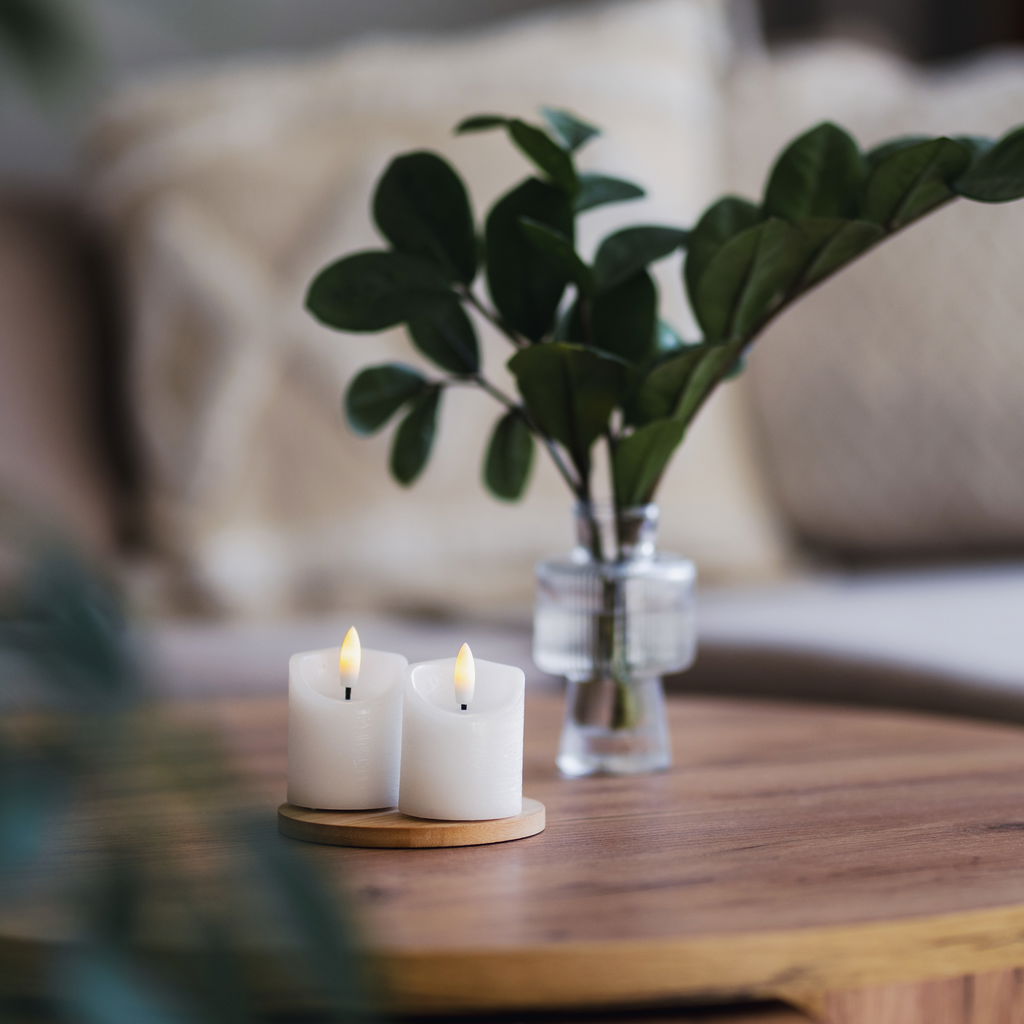 Blockljus med naturtrogen låga Flamme Soft, drivs med 2 AA batterier.