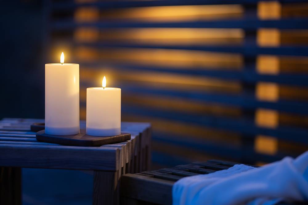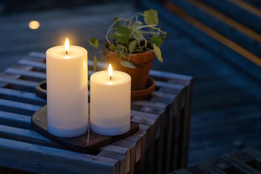 Vitt plastljus som passar bra att lysa upp i en lykta eller som dekoration på en uteplats eller en balkong.