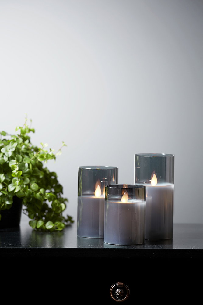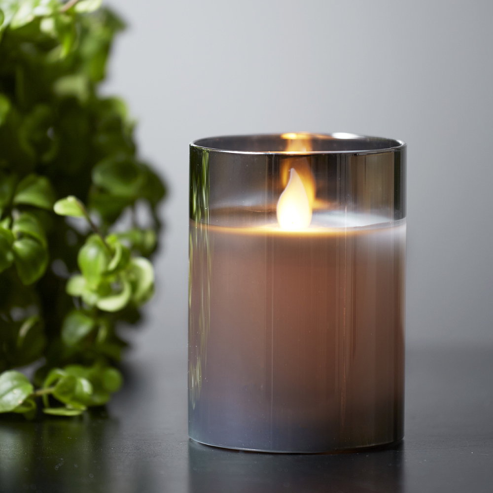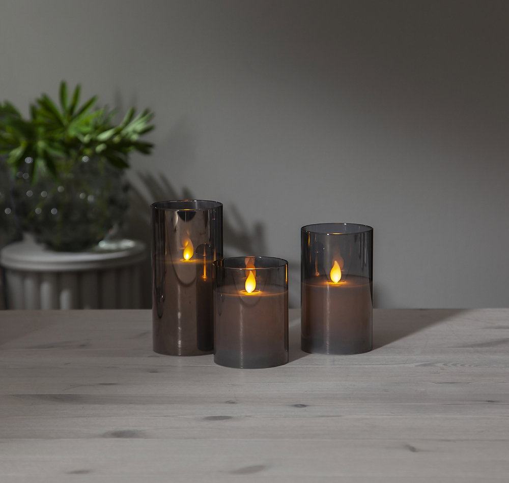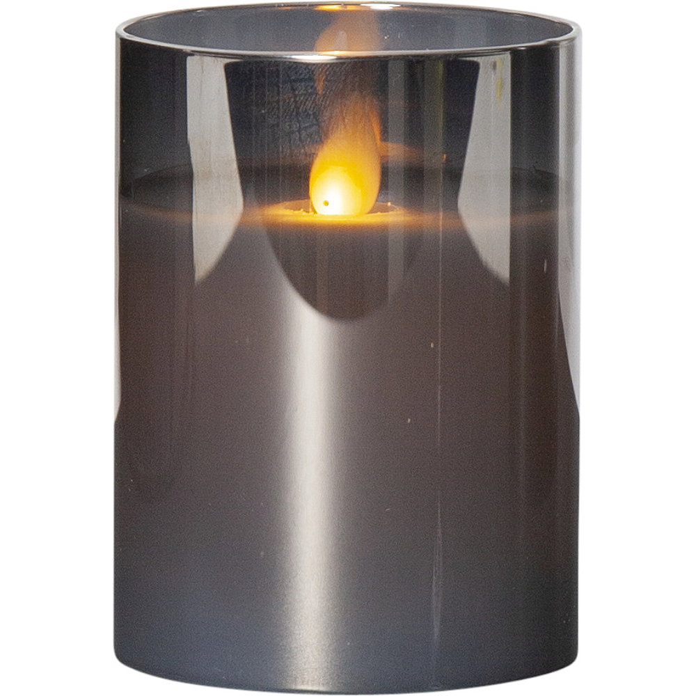Rökfärgad glaslykta med batteriljus, Twinkle flamman lyser med ett naturligt gyllene sken. Timerfunktion gör det enkelt att ställa in när ljuset ska lysa.
