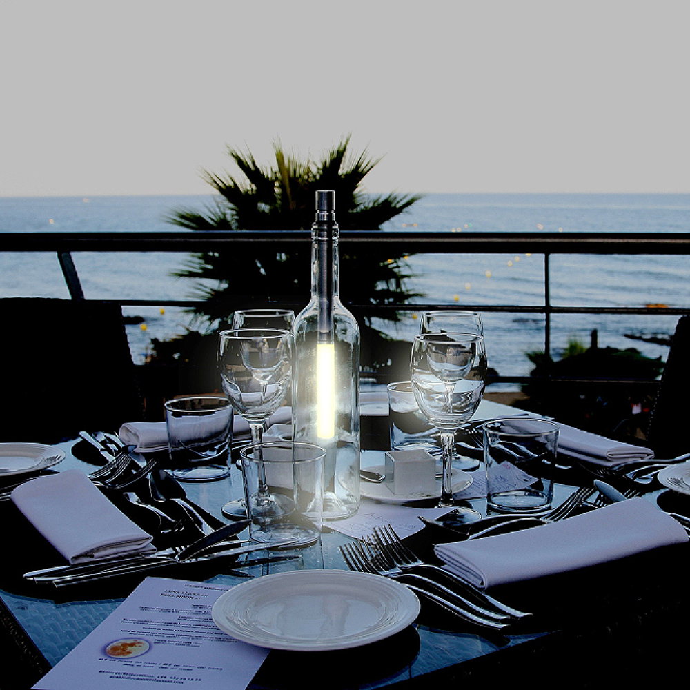 Flasklampa som passar i alla vinflaskor eller andra flaskor. Den lyser med ett kallvitt LED-ljus med 15lm.