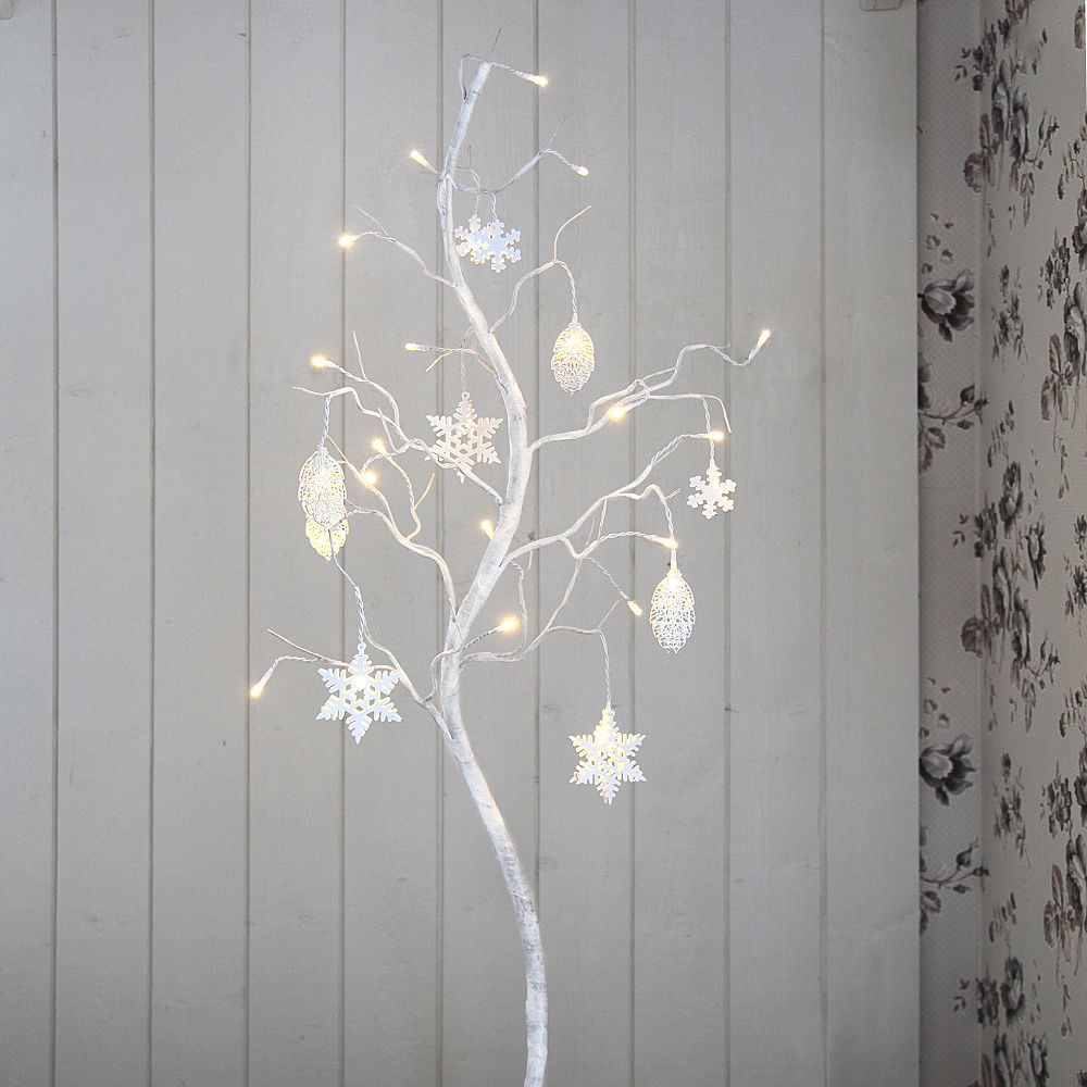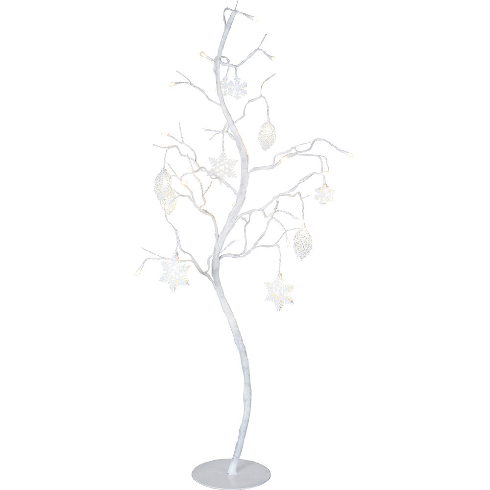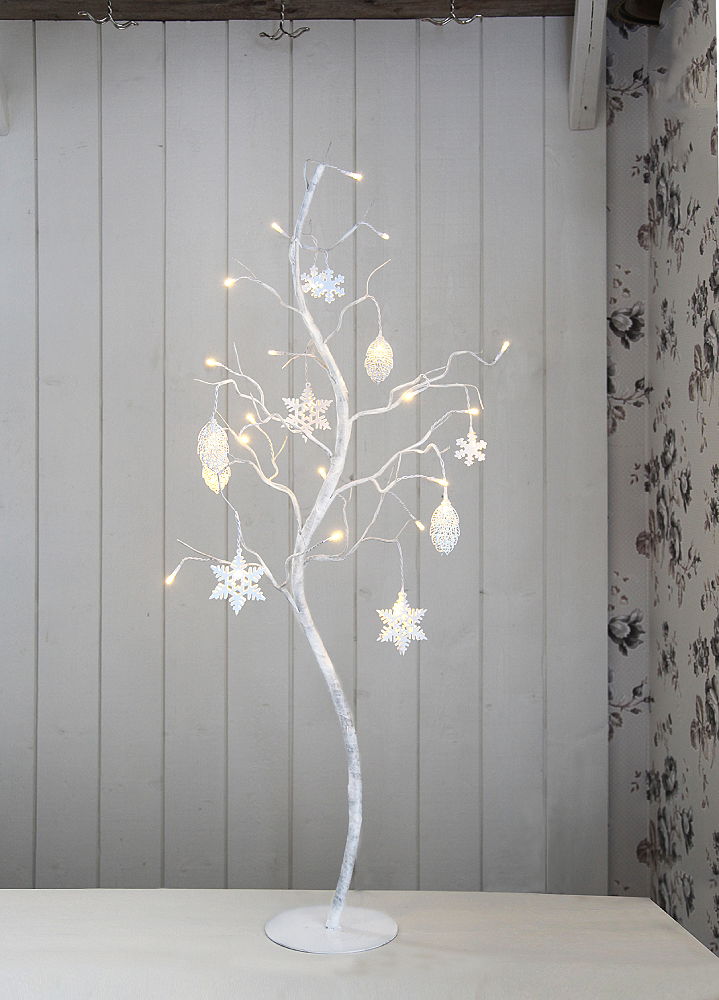 Vitt dekorationsträd med fina metalldetaljer. Trädet har 27 LED-ljuskällor som ger ett härligt varmvitt sken.