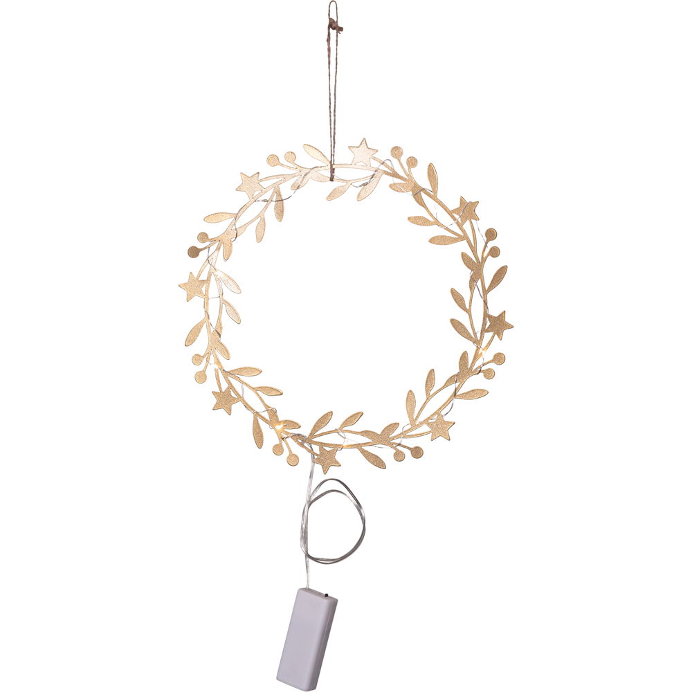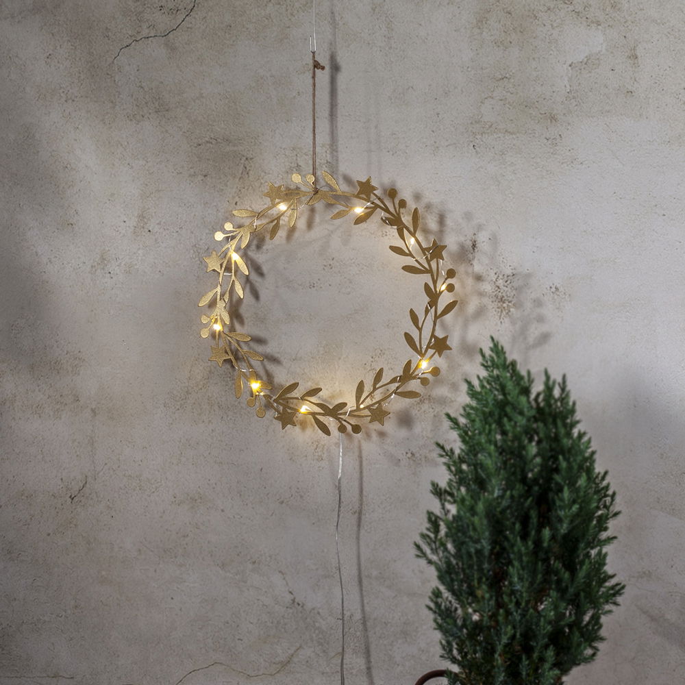 Den nätta metallkransen Holiday sprider varm stämning med 10 LED-ljus och timerfunktion. Batteridriven och enkel att hänga upp inomhus.