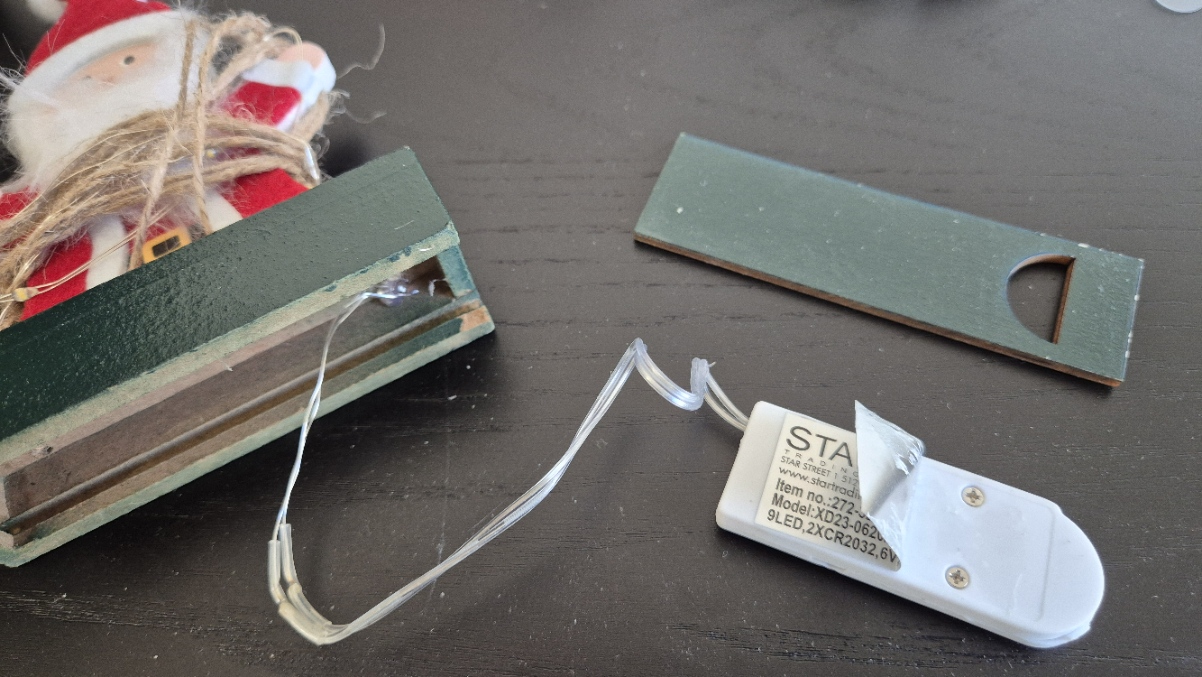 Batteridriven tomte som gungar. Tillverkad i trä. Lyser fint med LED lampor som är virande runt gungans rep.