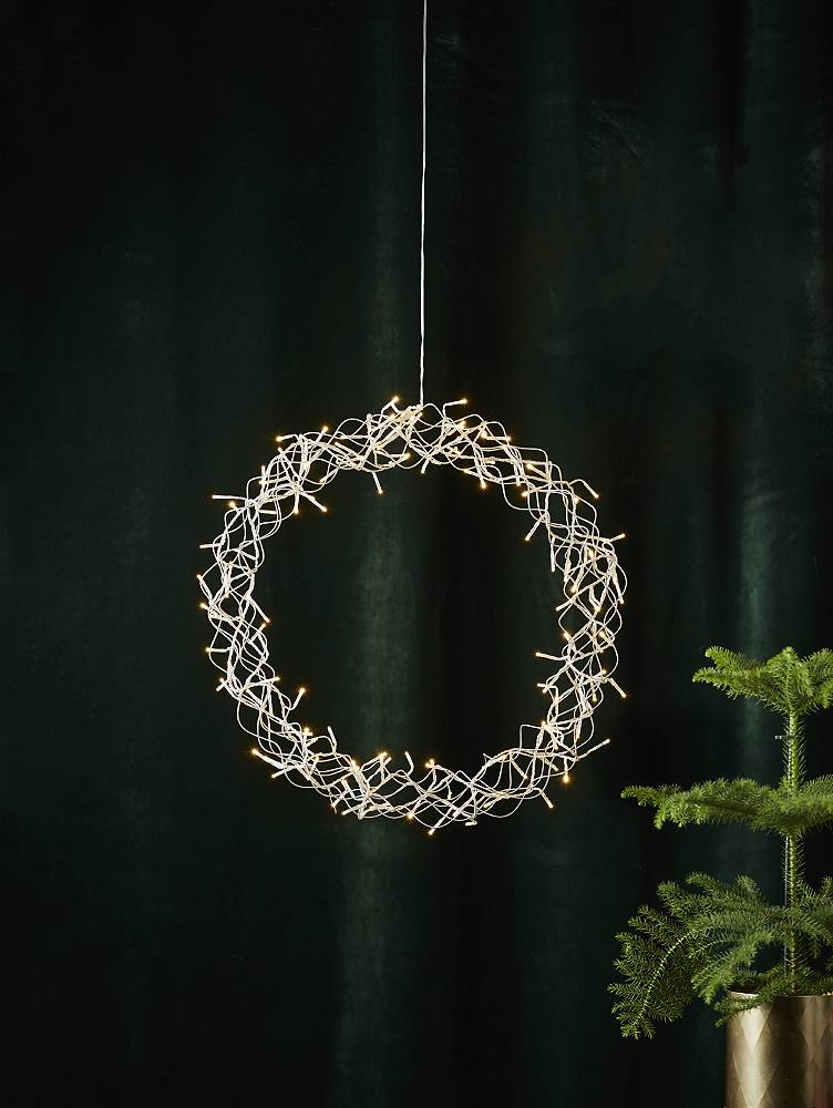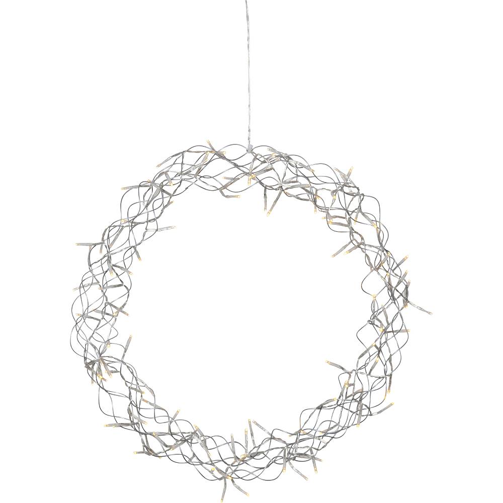 Vacker krans i silver för inomhusbruk. Kransen har 136 LED-ljuskällor med varmvitt sken. En underbar hängande dekoration att ha i hemmet.