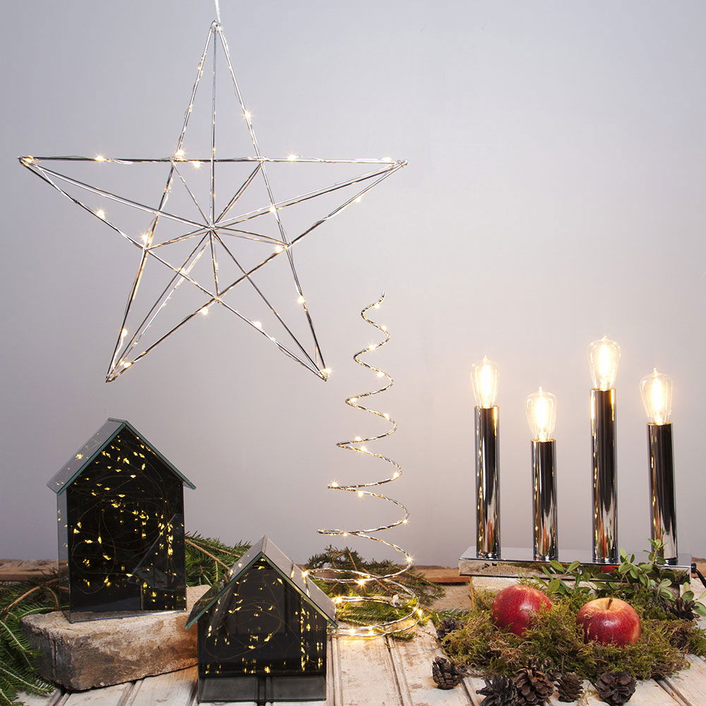 Dekorativ stjärna i kromfärgad metall för inomhusbruk.