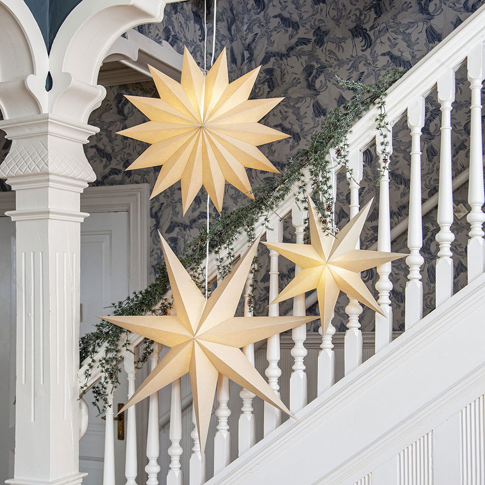 Denna beige adventsstjärna i FSC®-märkt papper skapar lugn och balans i julens glittriga myller. Placera den hängande.