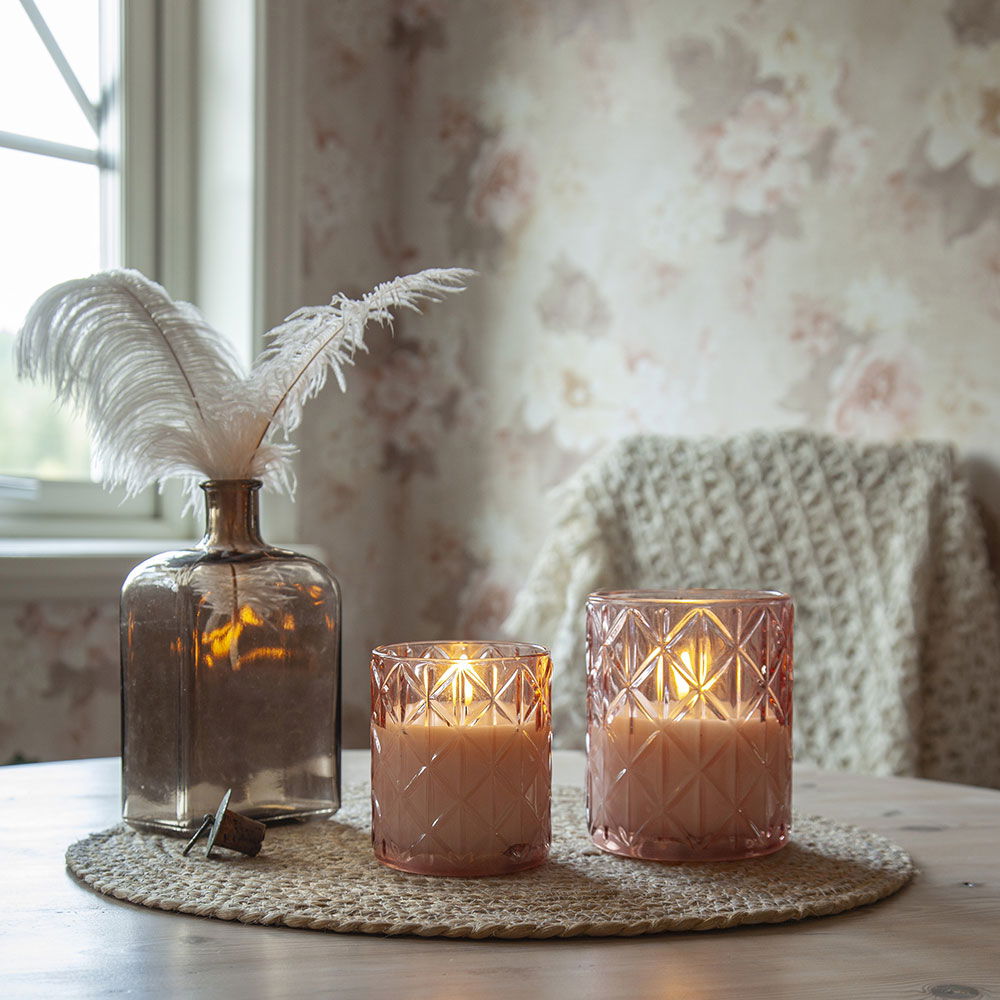 Flamme Romb har ett klart rosa glas hölje med rombformat mönster runt vaxljuset.