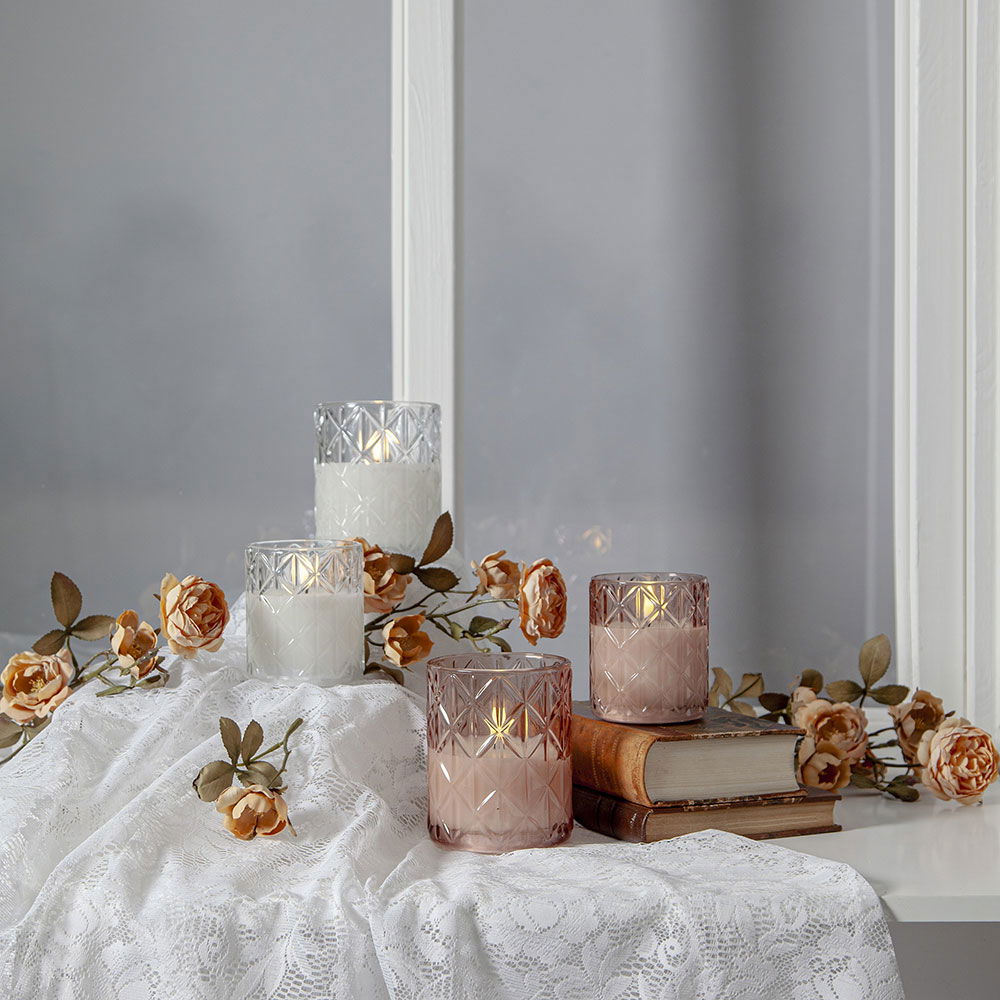 Flamme Romb har ett klart rosa glas hölje med rombformat mönster runt vaxljuset.