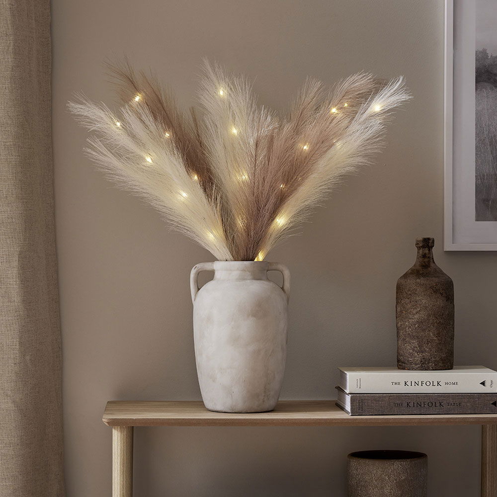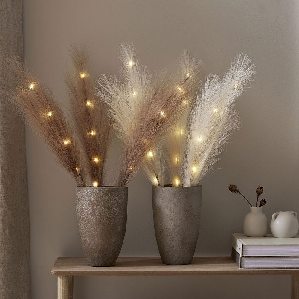 Batteridriven inomhusdekoration med konstgjorda större fjädrar i brunt.