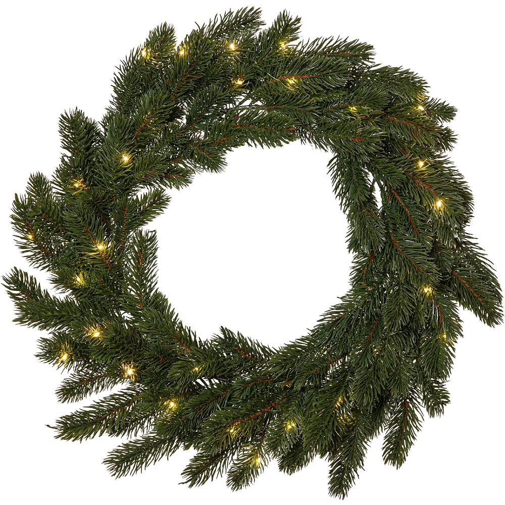 Erna är en vacker krans med mörkgröna barr gjorda i PE material som ser mycket naturtrogna ut.