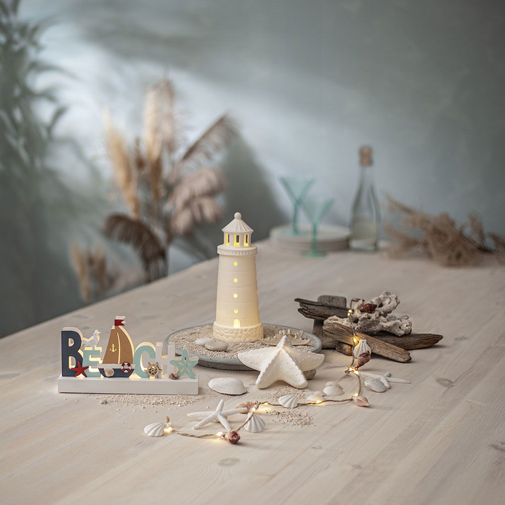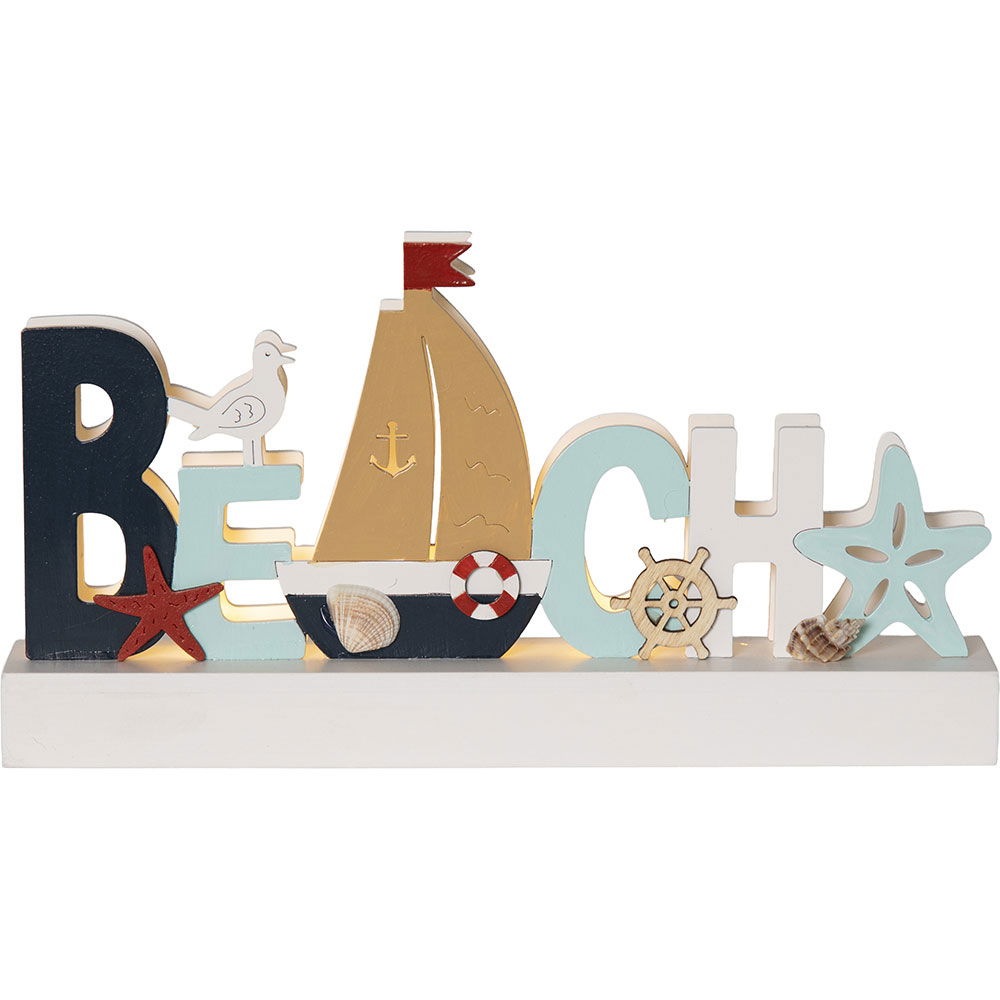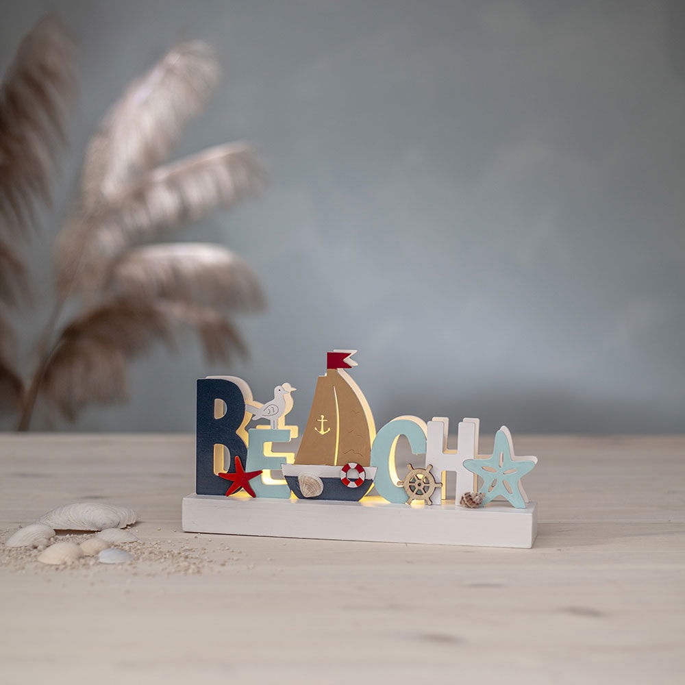 Batteridriven inomhusdekoration i trä med ordet "Beach".