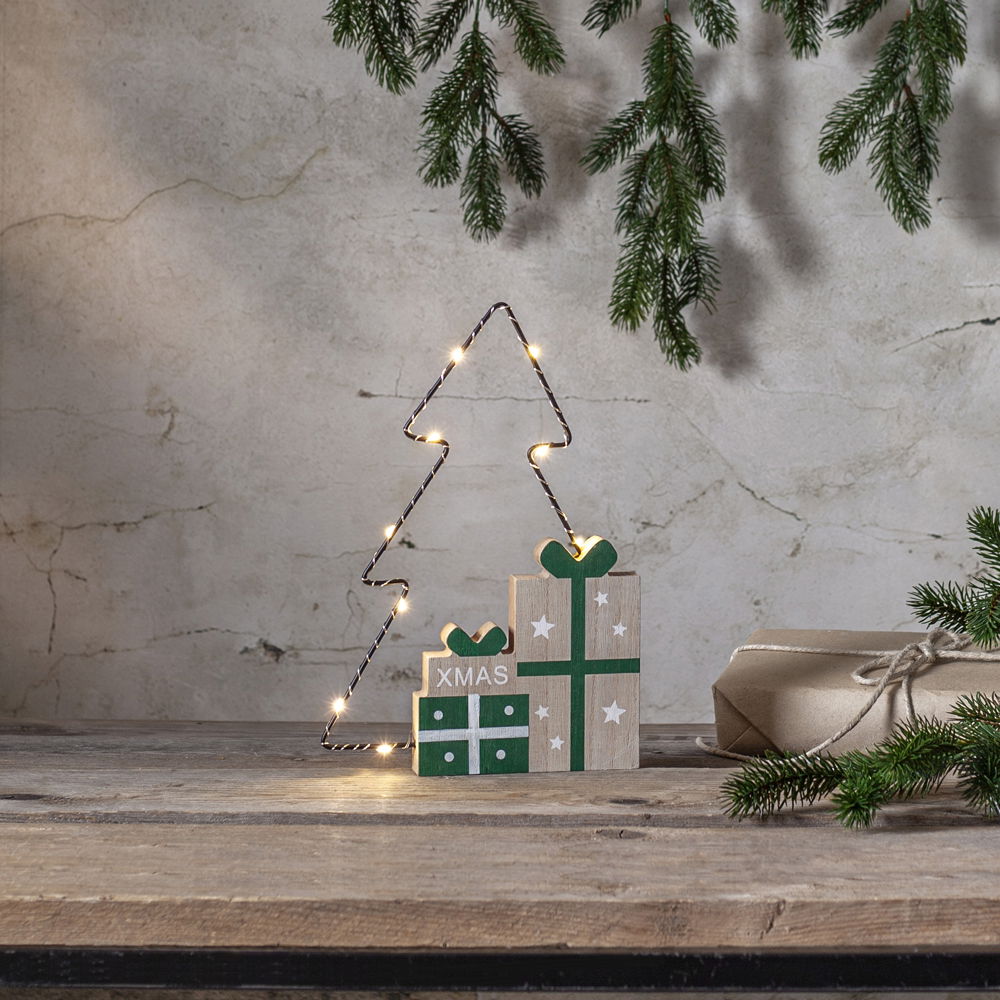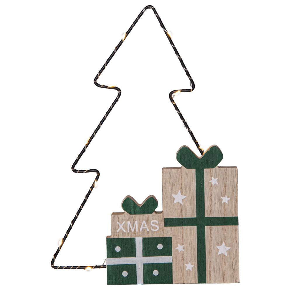 Fin juldekoration. Siluett i metall formad som en julgran med tillhörande fint målade paket i trä. Det lyser fint i siluetten från de små virade ledpunkterna.
