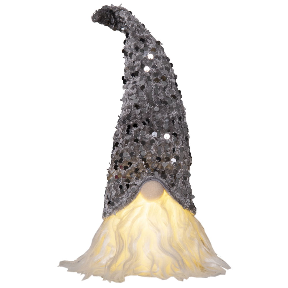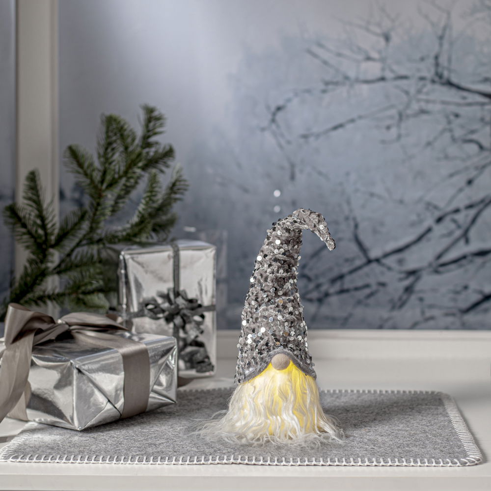 Charmig batteridriven tomte med glittrig grå luva dekorerad med silverpaljetter.