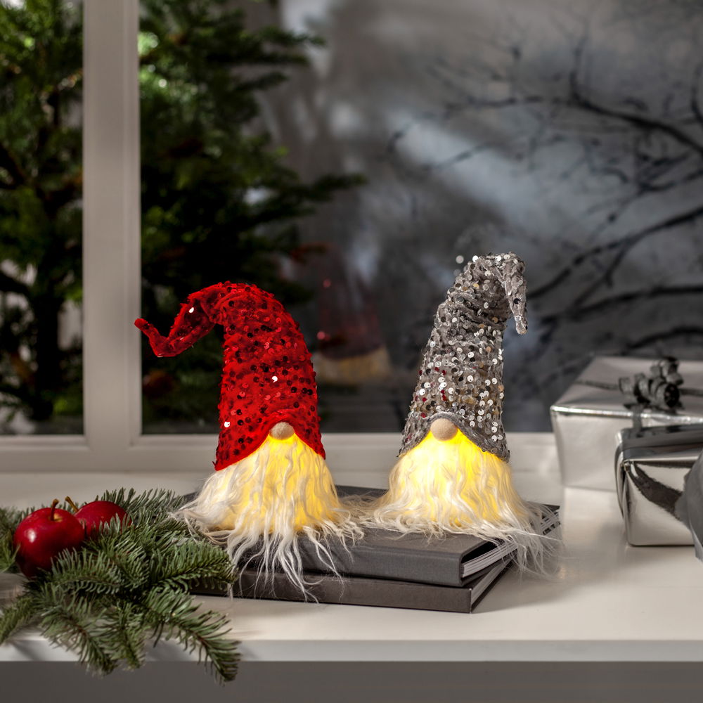 Charmig batteridriven tomte med glittrig röd luva dekorerad med röda paljetter.