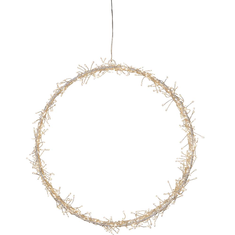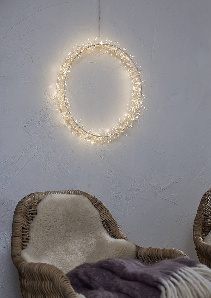 Vit metallram med många små ljuspunkter som ger ett härligt och stämningsfullt sken.