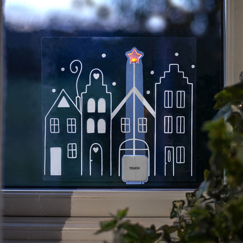 Batteridriven fönsterdekoration med vit siluett av fyra hus och en stämningsfullt glimmande stjärna – fäst flera bredvid varandra för en hel liten stad.