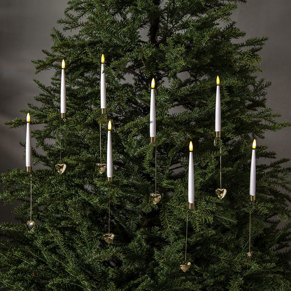 Stilfull julgransbelysning med 8 vita LED-ljus på guldfärgade hållare med dekorativa hjärtan.