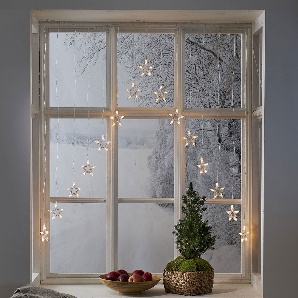 Vacker dekoration för fönster med en stjärna längst ner på varje kabelsträng.