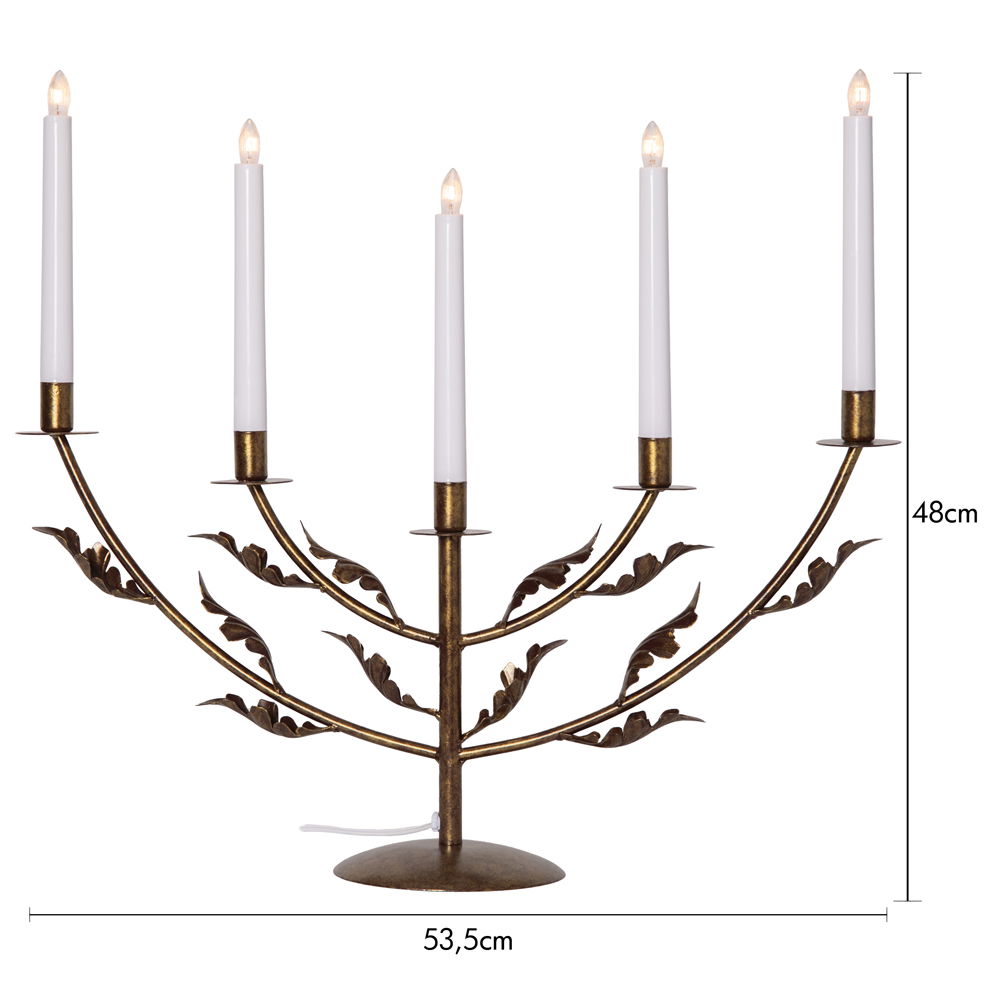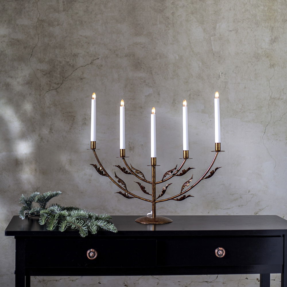 Elegant adventsljusstake i metall dekorerad med eklöv.