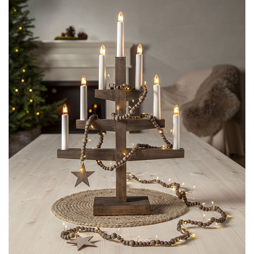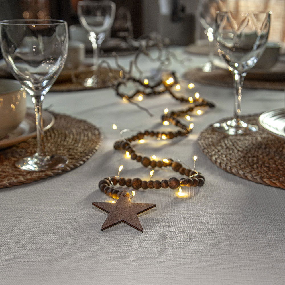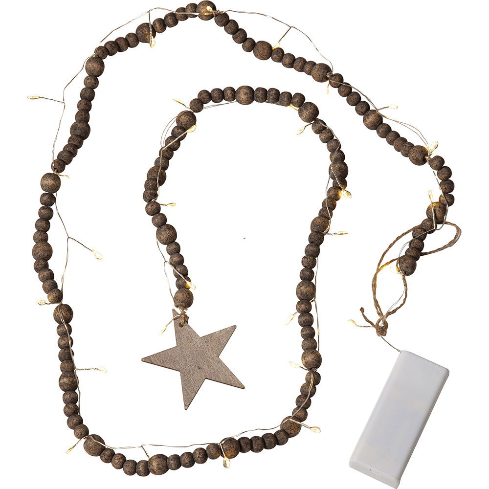 Exklusiv ljusslinga för inomhusbruk med träpärlor.