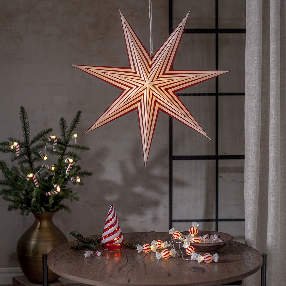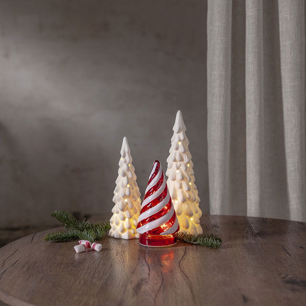 Snygg batteridriven bordsdekoration i form av en gran i rött och vitt glas, som en polkagris.