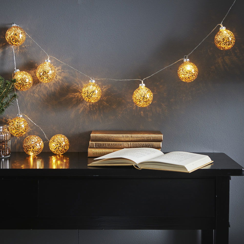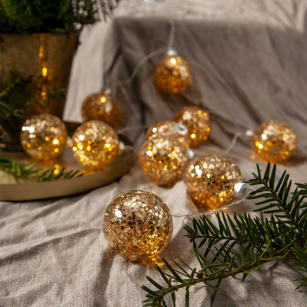 Elegant ljusslinga med 10 glasbollar fyllda med skimrande guldpaljetter.