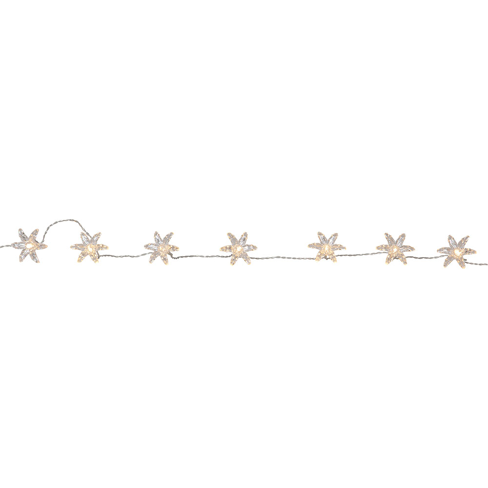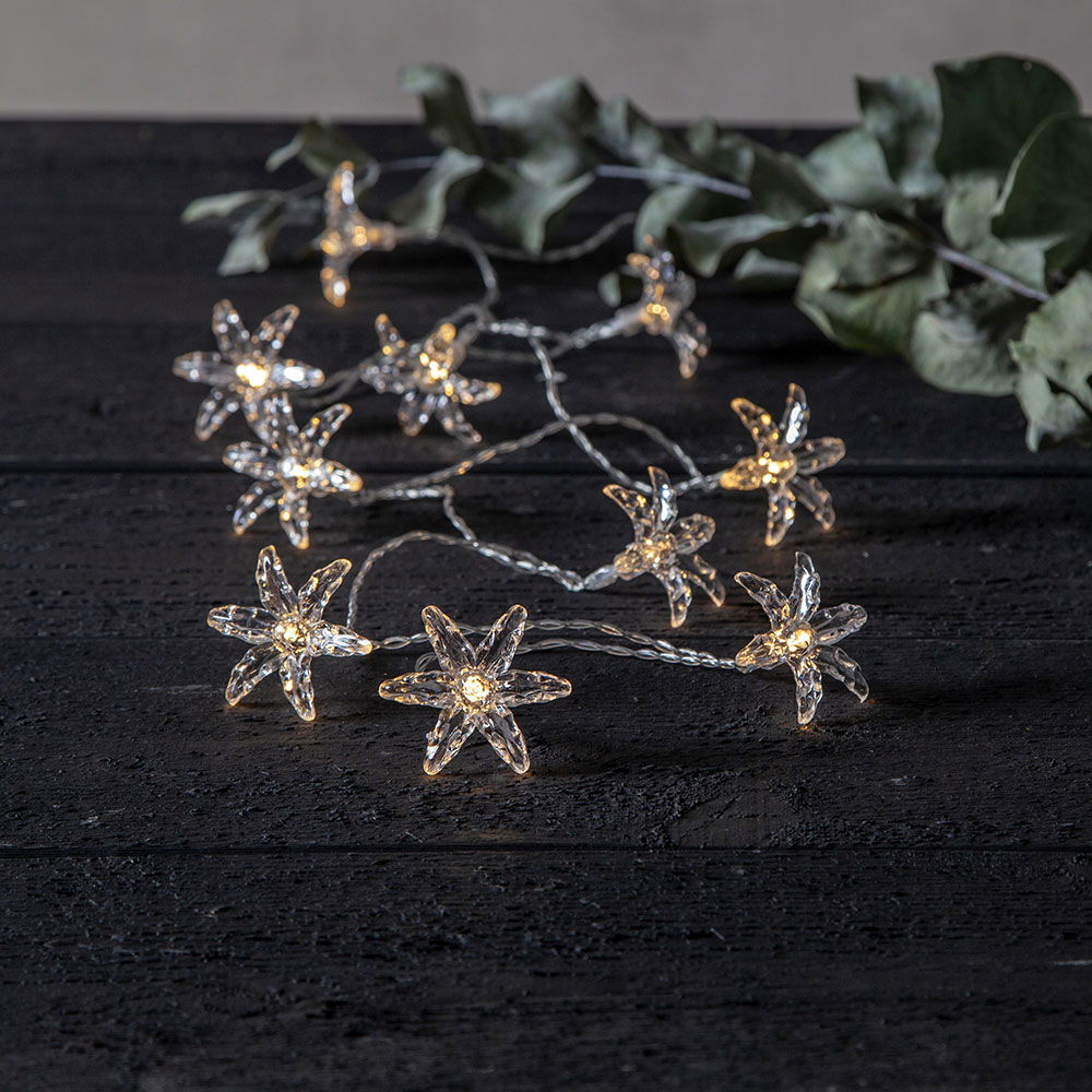 Batteridriven ljusslinga med transparenta dekorationer i form av blommor.