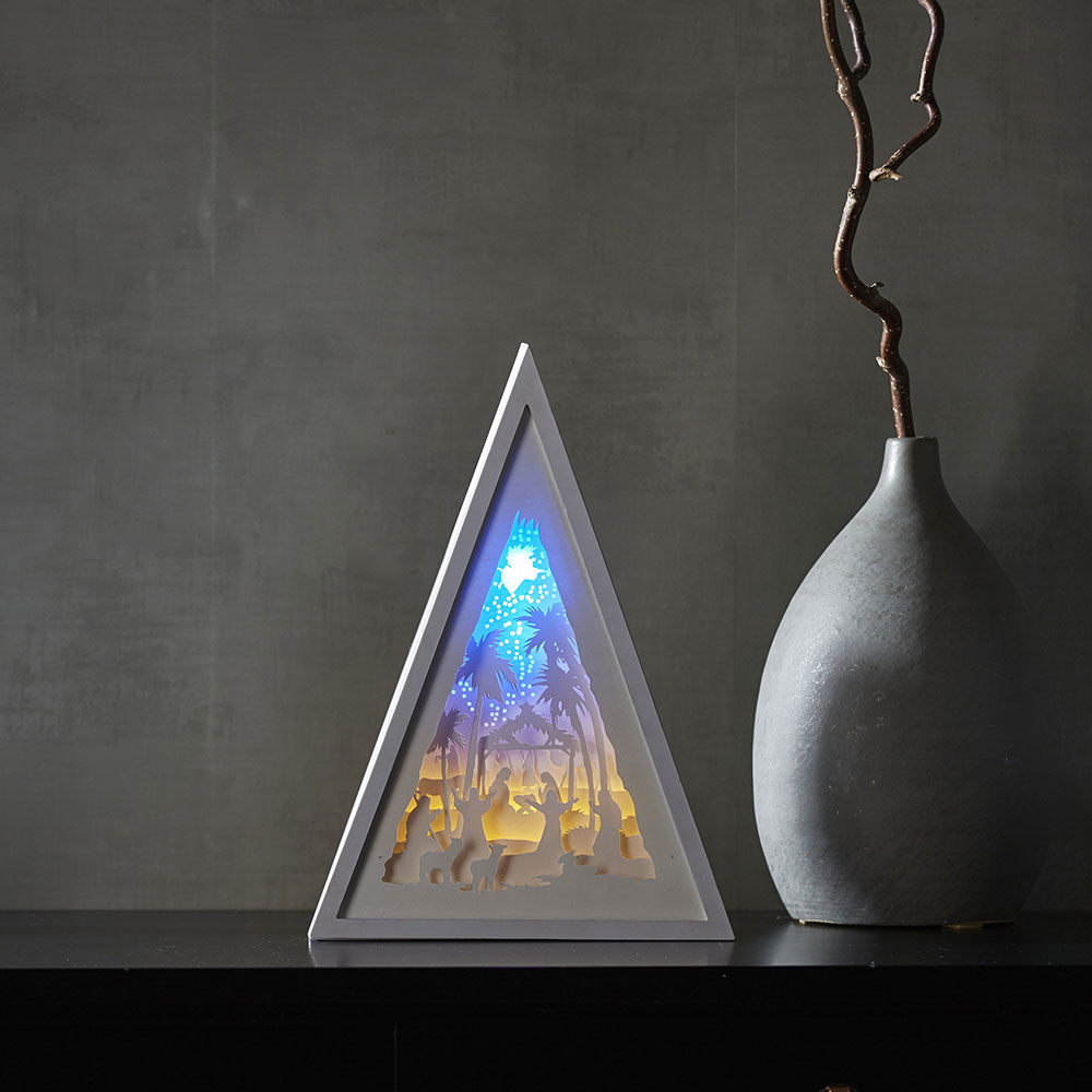 Träljusstake med de tre visemännen, Maria och Josef. Jesusbarnet ligger på en bädd.