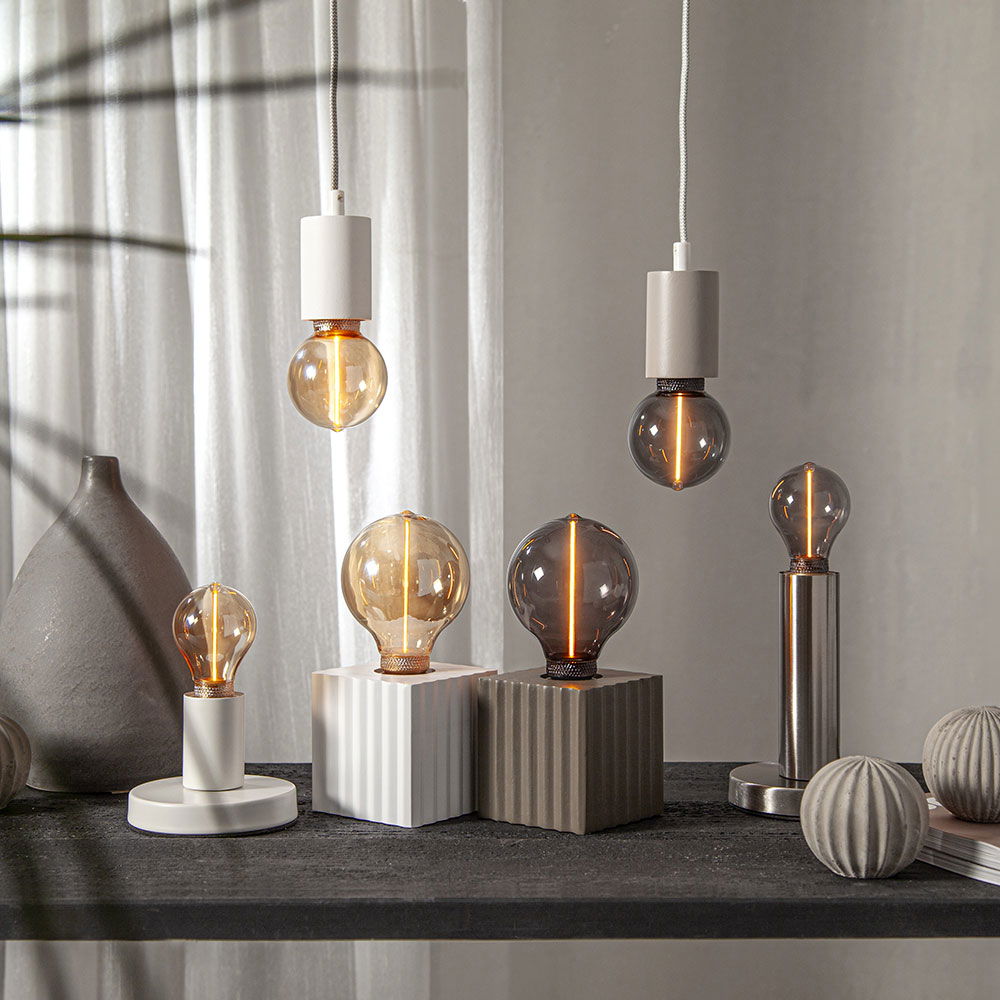 Dekorativ rökfärgad normallampa med 3-stegs klickdimring, ljusstyrkan ändras enkelt genom slå av och på strömbrytaren.