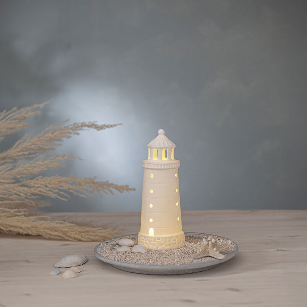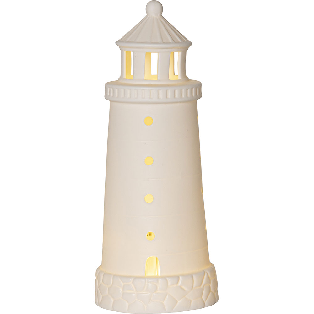 Batteridriven inomhusdekoration i form av en fyr. Tillverkad av matt vitt porslin.