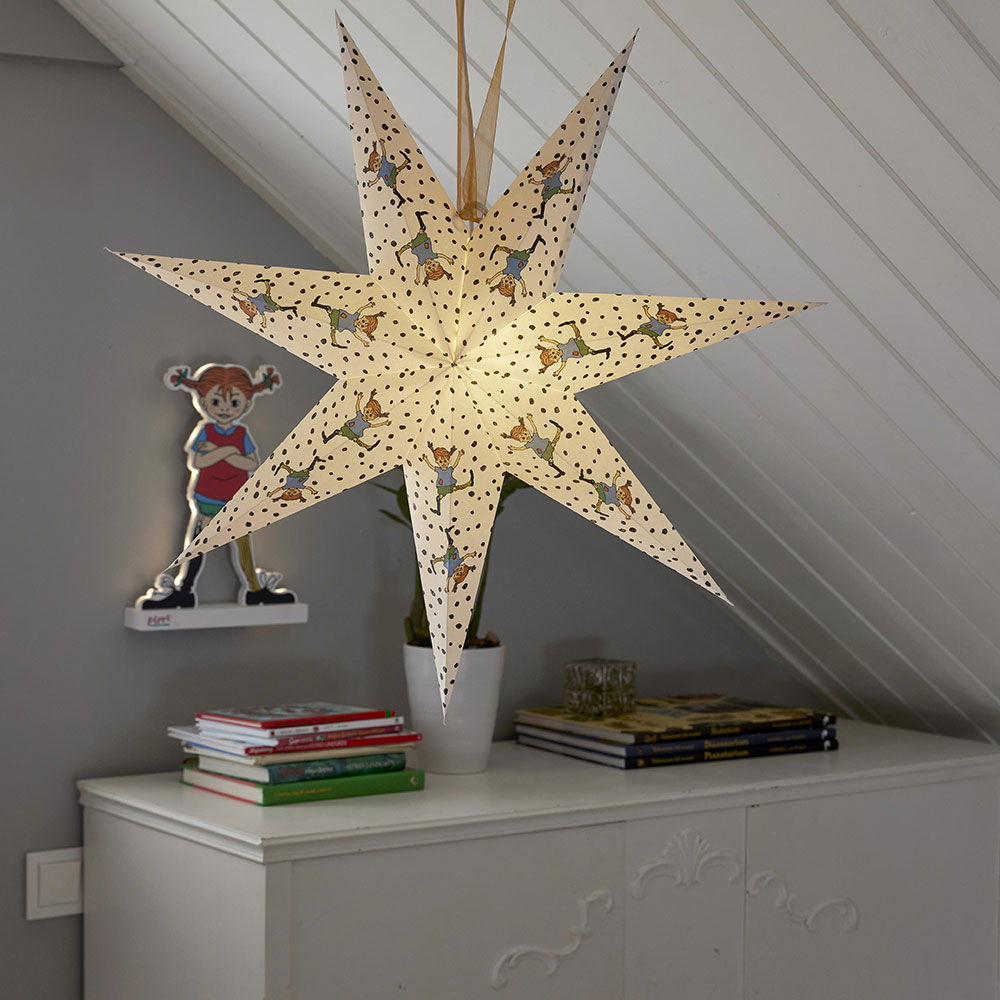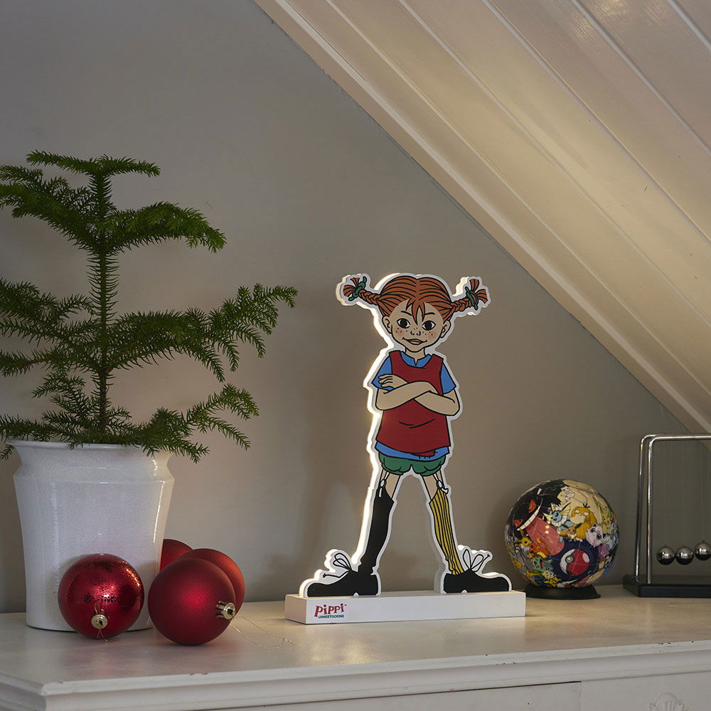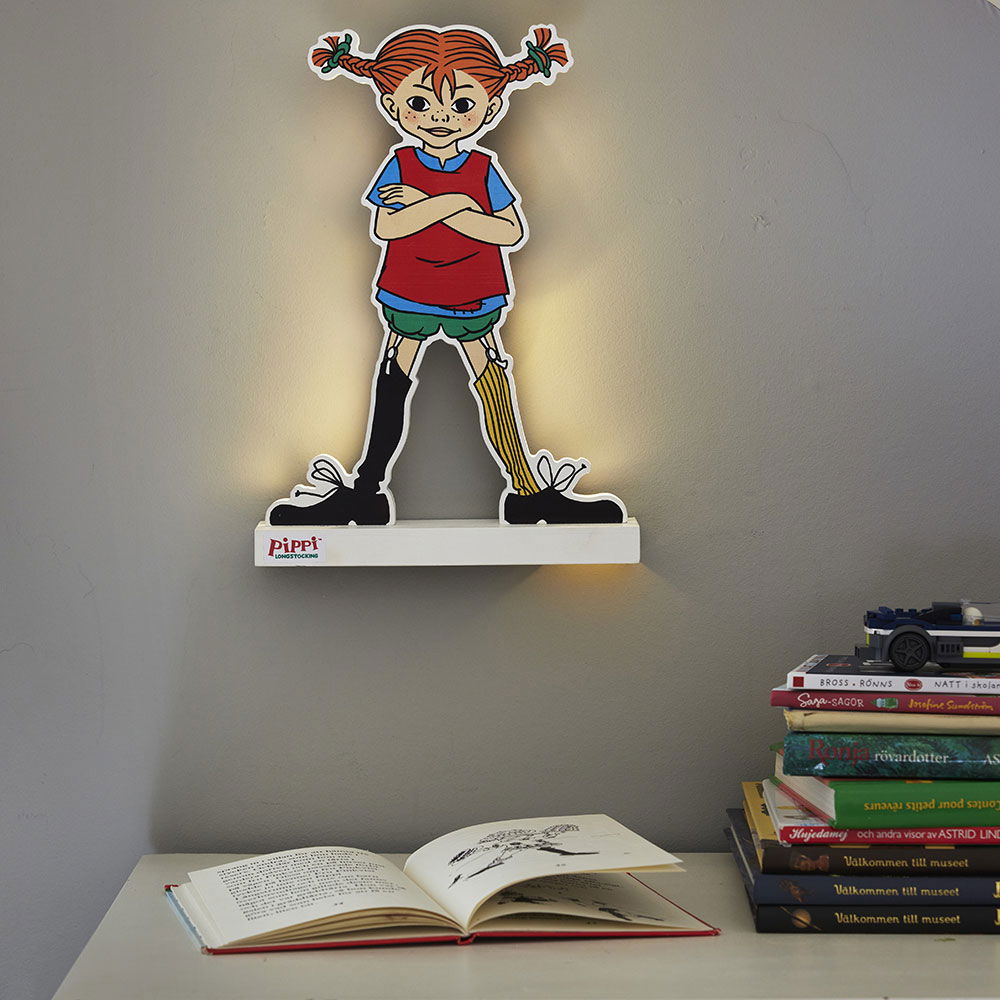 Pippi kan hängas på väggen i sitt väggfäste eller ställs lätt i rummet, kanske i fönstret, på ett skrivbord eller på din byrå?
