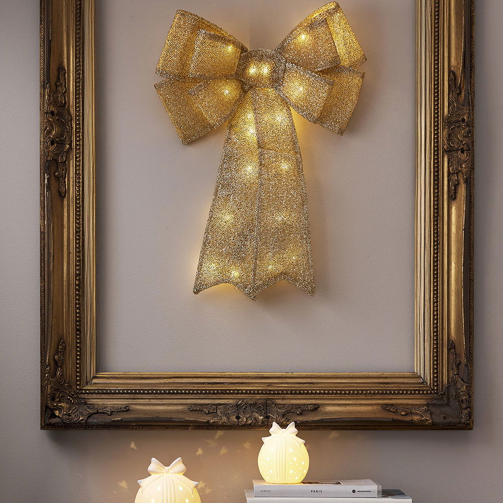 Elegant stor guldrosett med små LED-ljus som sprider varmt sken.
