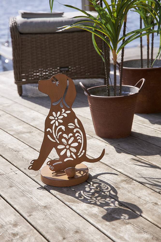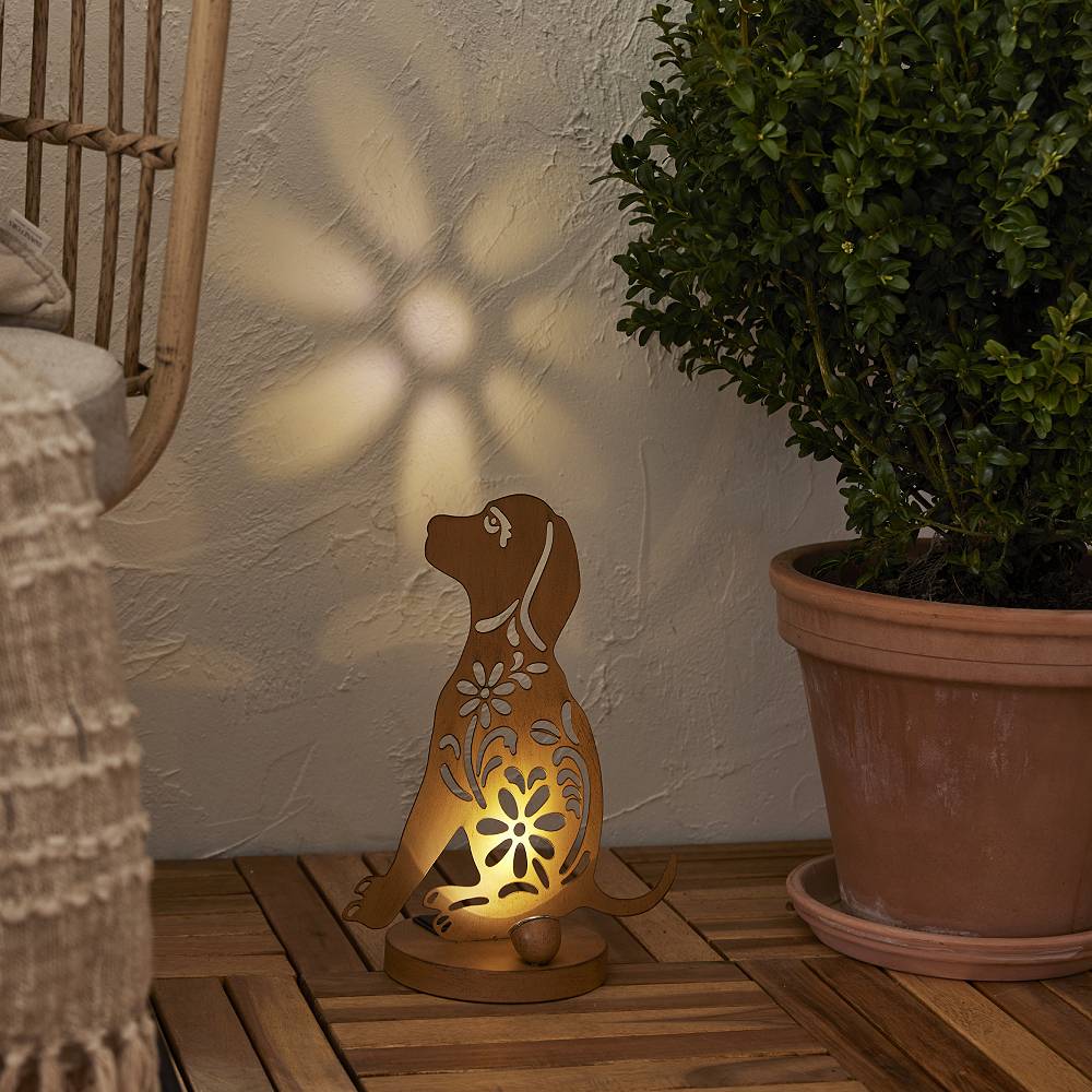 Oxidog blir fin att dekorera med på en trapp, rabatt eller på en balkong och den är lika vacker tänd som släckt. I mörkret lyser den upp med ett varmvitt sken och om den placeras mot en vägg så bildas det en vacker skuggeffekt.