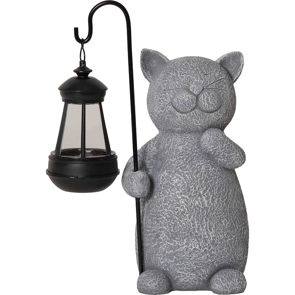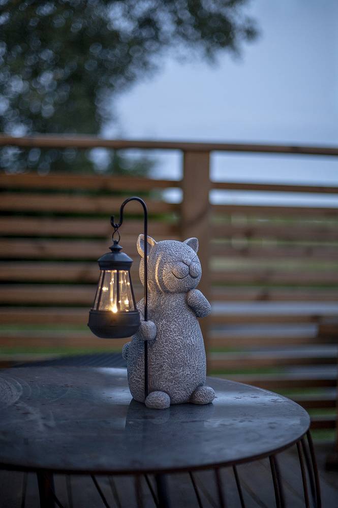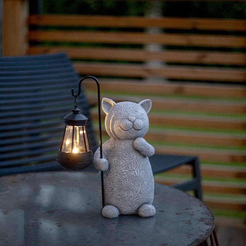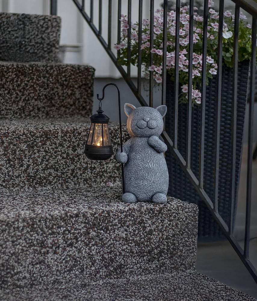 Solcellsdekoration tillverkad av polyresin som imiterar granit. En katt håller en lykta som lyser med ett varmvitt ljus.