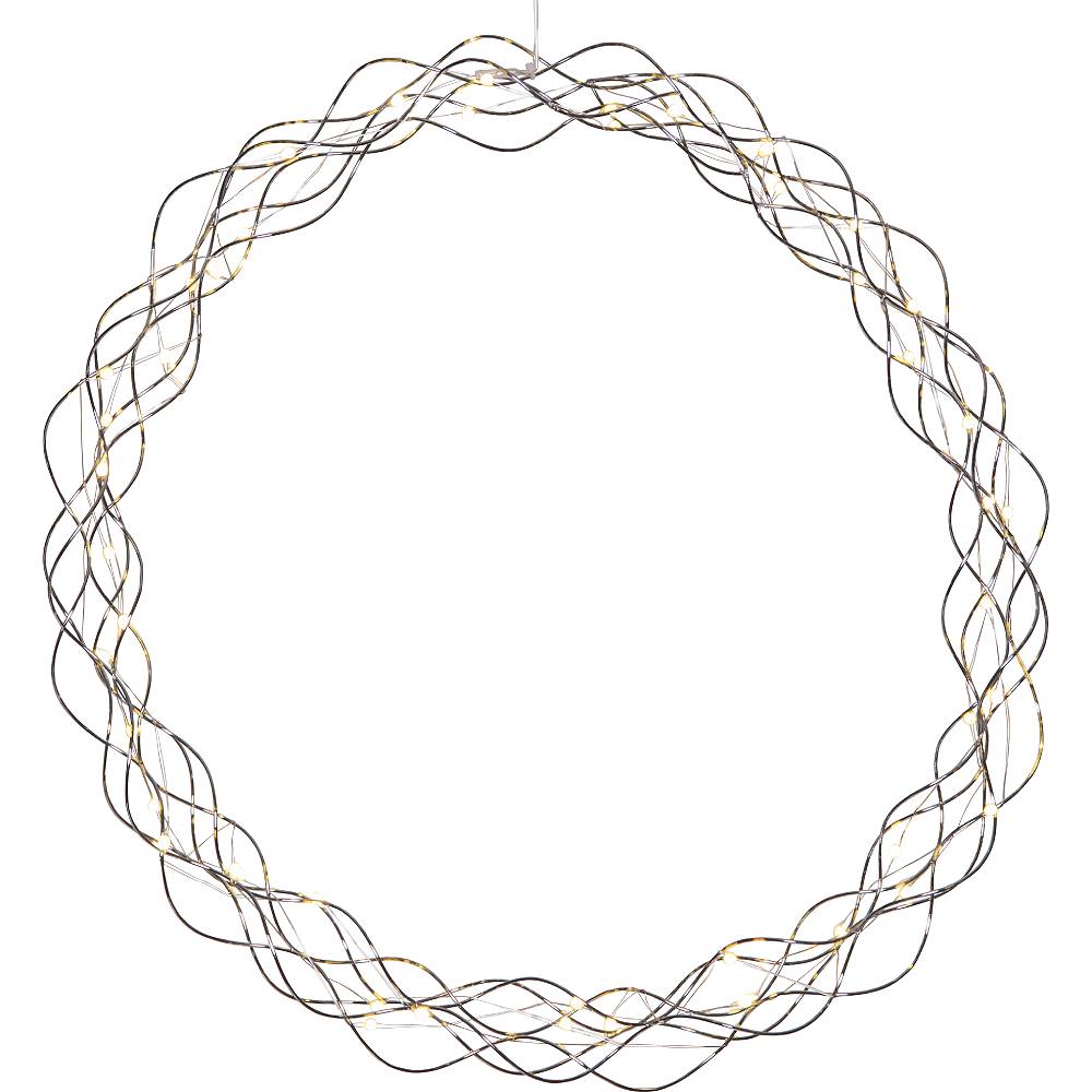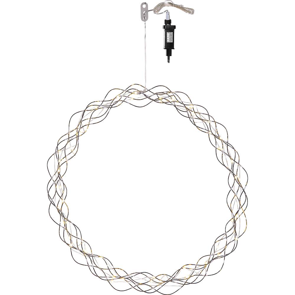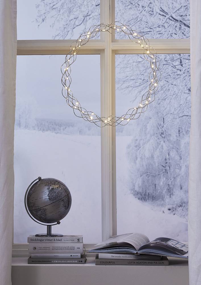 Kransen har 50 LED-ljuspunkter med varmvitt sken. Dimmer i tre steg och timer.