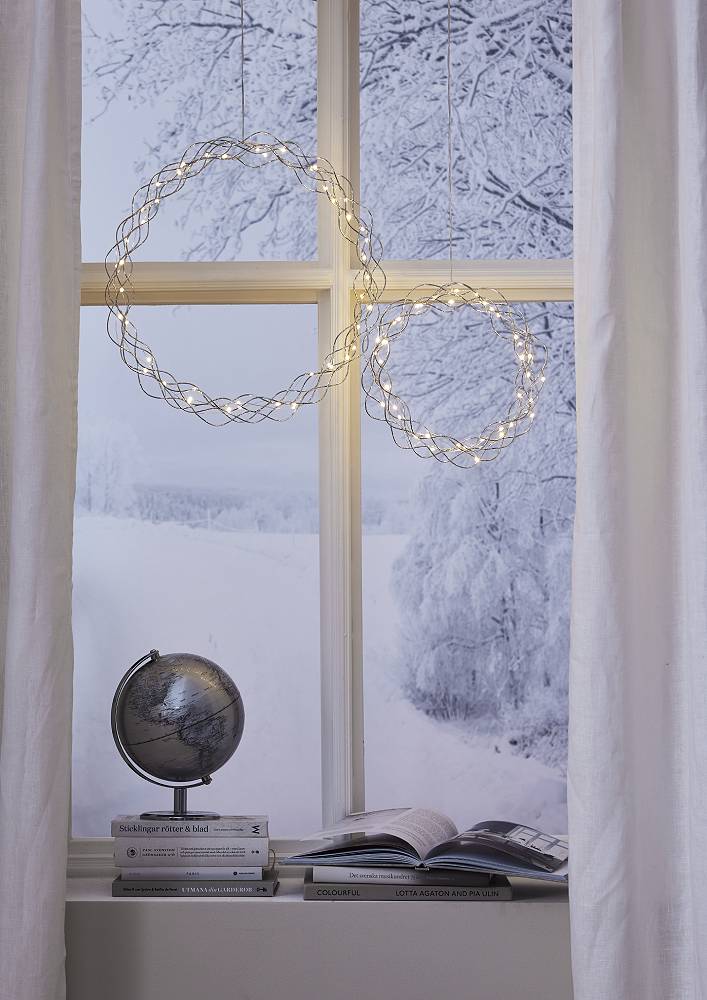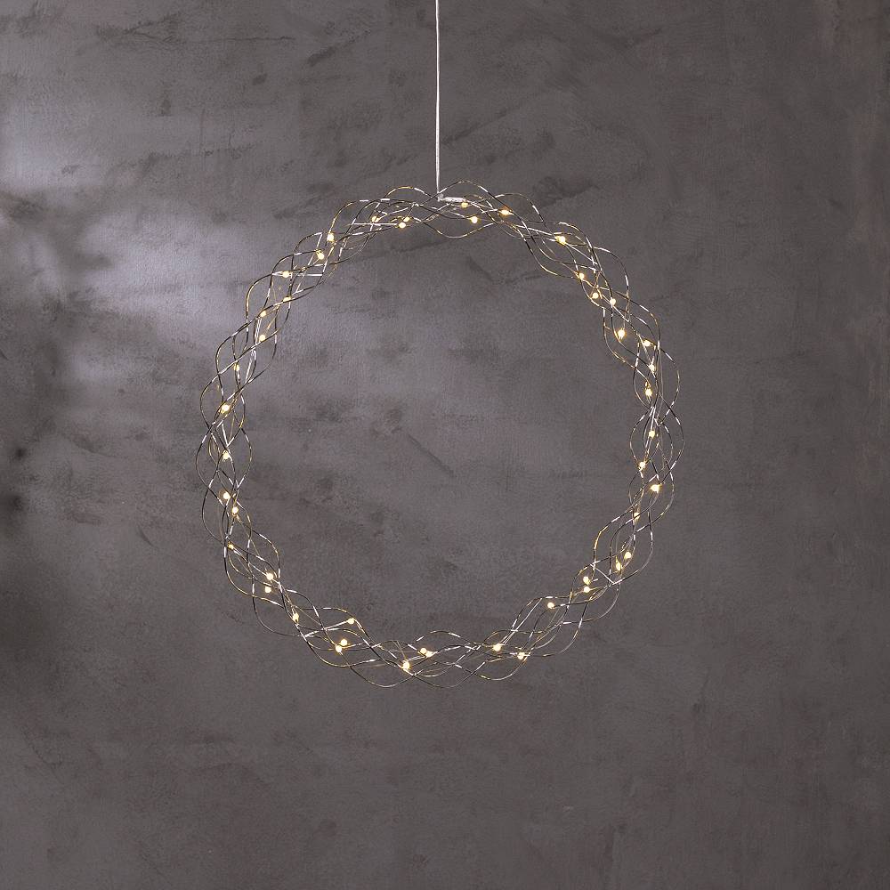 Dekorativ kromfärgad krans med dew drop ljusslinga för inomhusbruk.