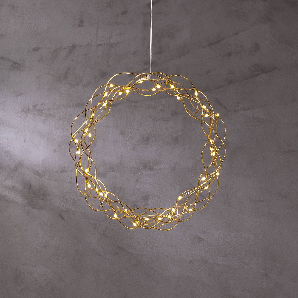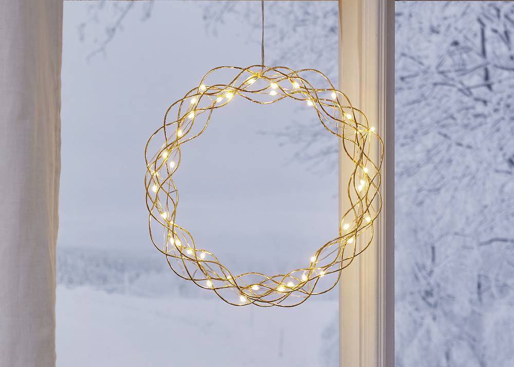 Dekorativ mässingsfärgad krans med dew drop ljusslinga för inomhusbruk. Kransen har 40 LED-ljuspunkter med varmvitt sken. Dimmer i tre steg och timer .Fin dekoration att hänga i fönstret.