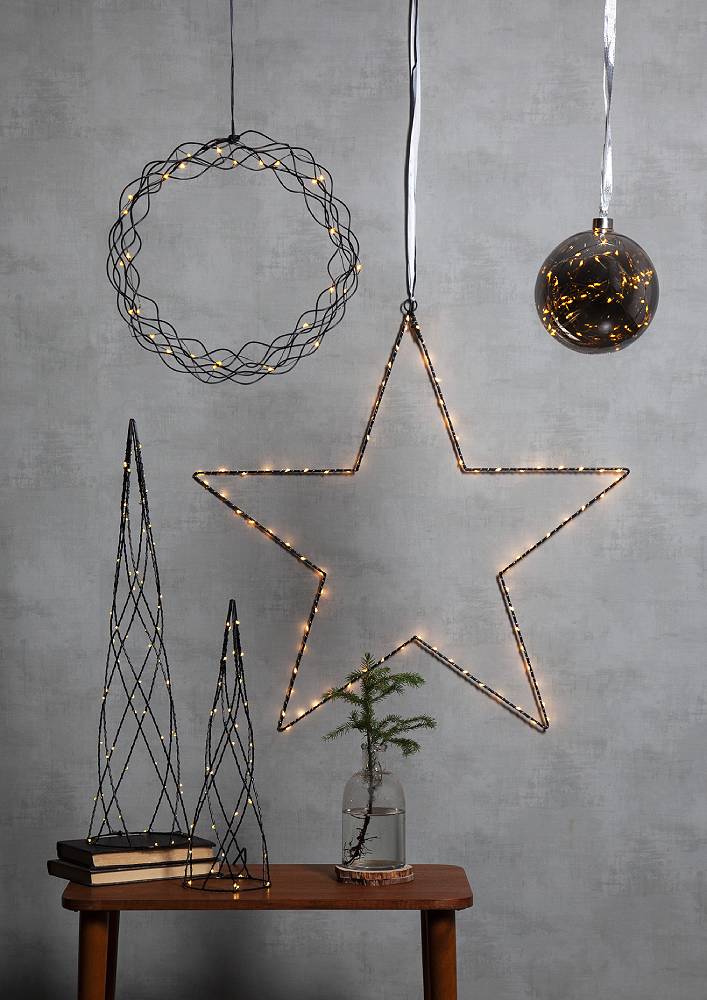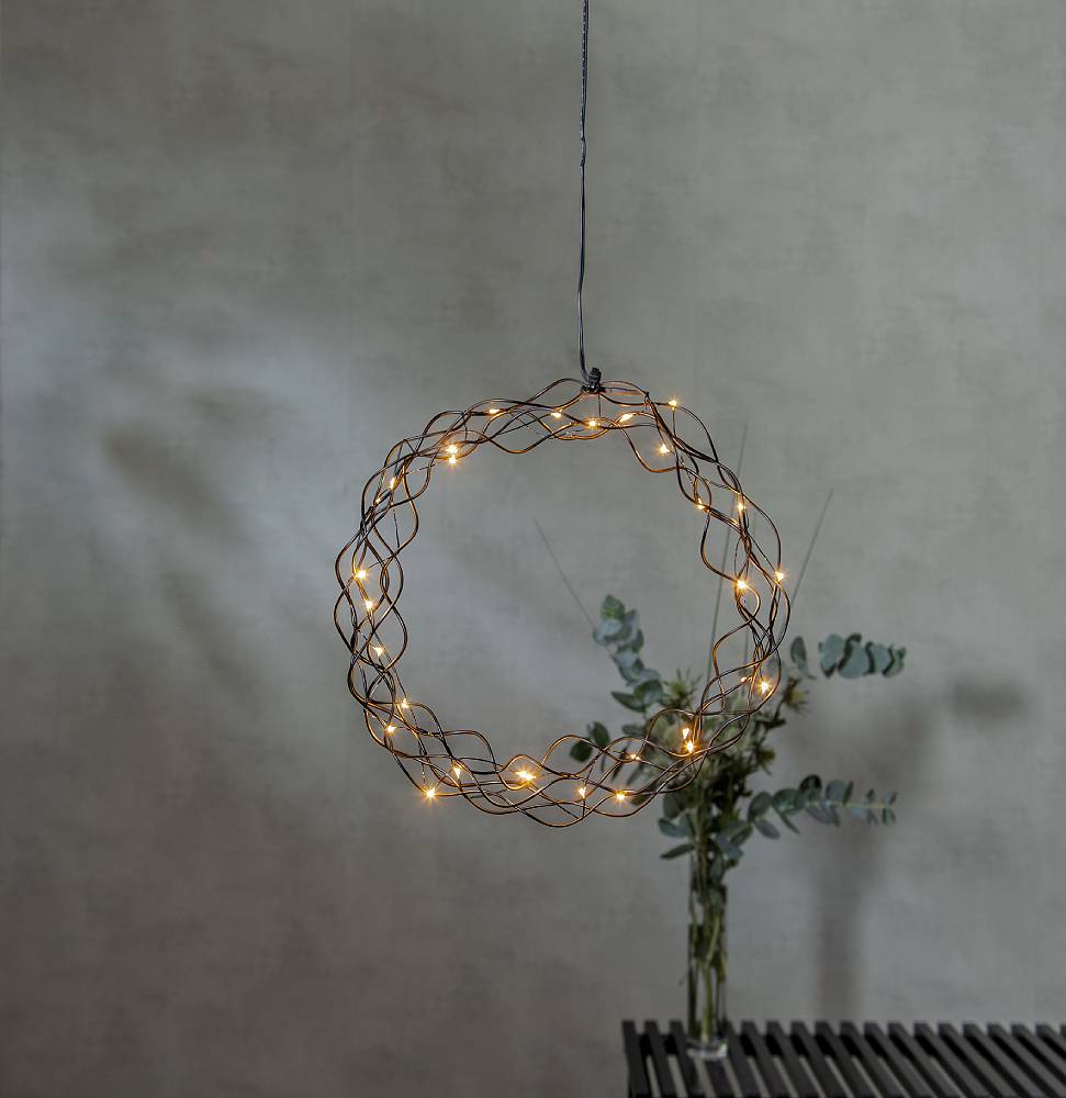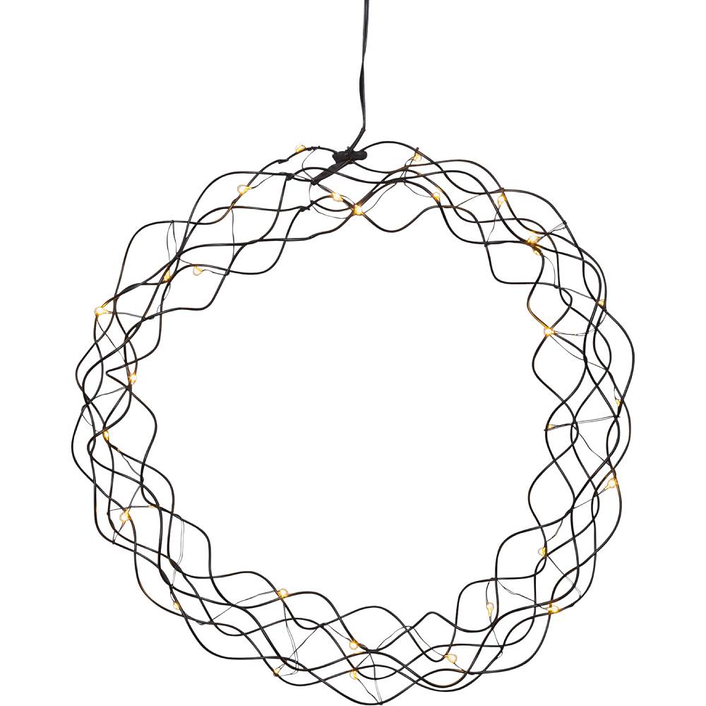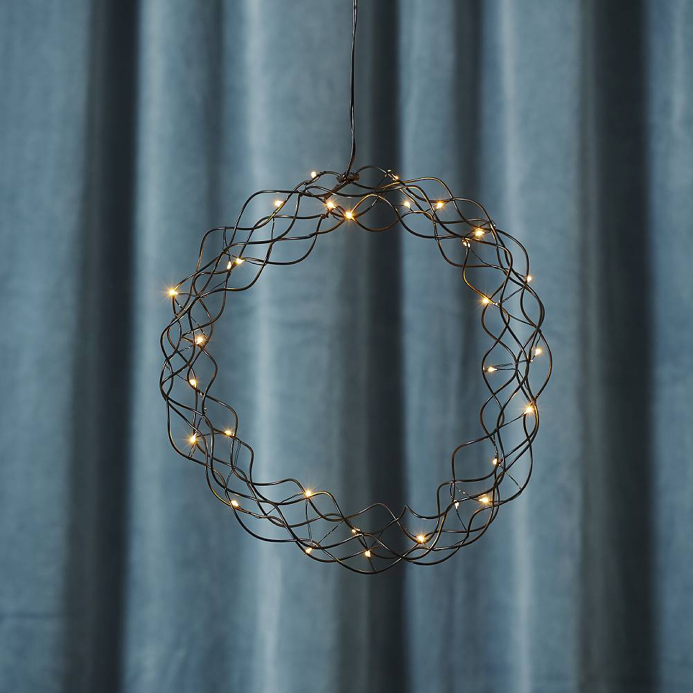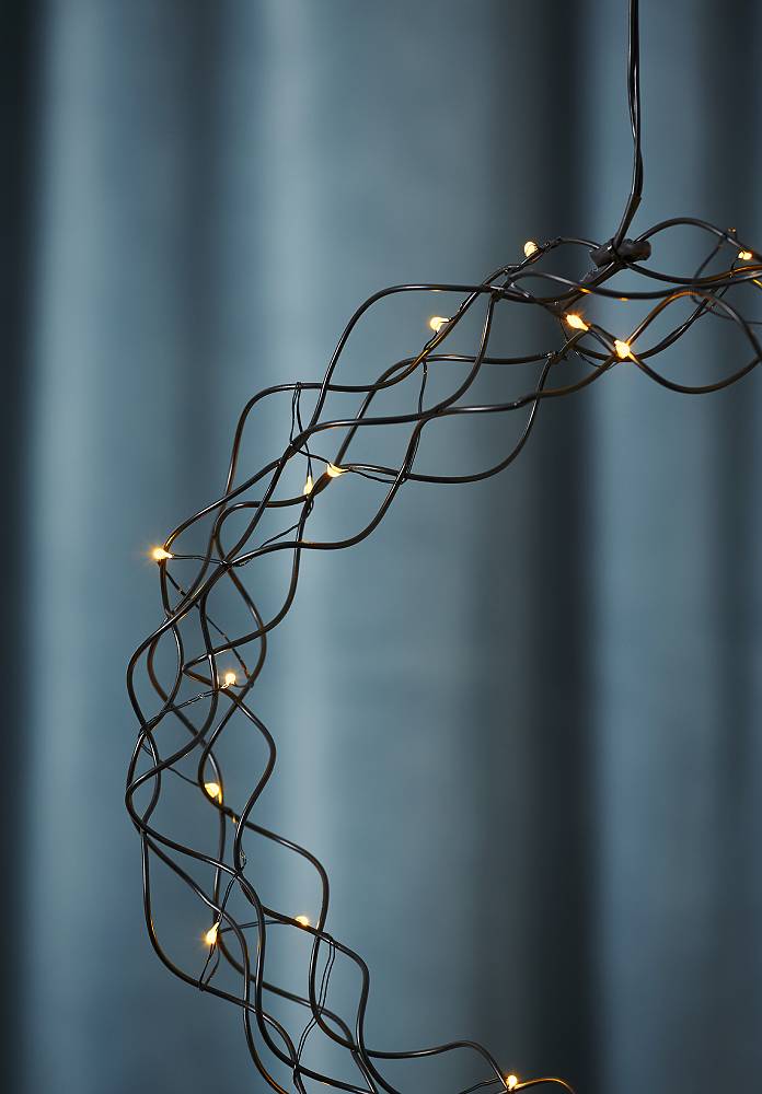 Dekorativ krans i svart med dew drop ljusslinga för inomhusbruk. Kransen har 30 LED-ljuskällor med varmvitt sken.