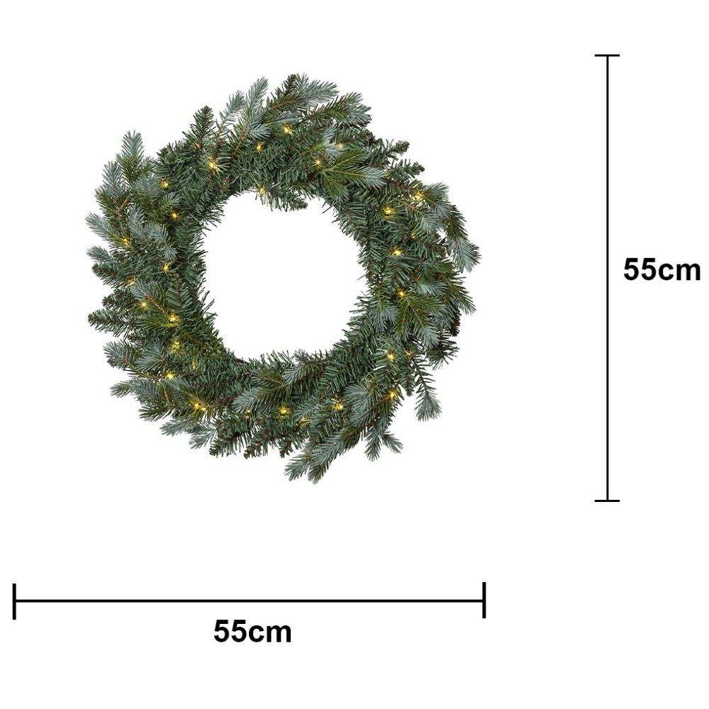 Stor och vacker krans i grågrön mix av PE- och PVC-grenar med 80 varmvita LED-ljus. Batteridriven med timerfunktion och passar både inomhus och utomhus.