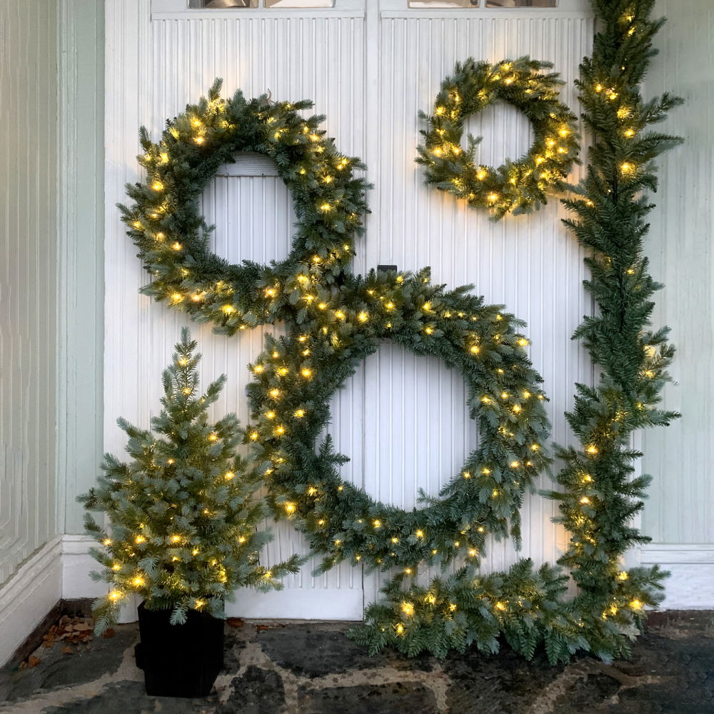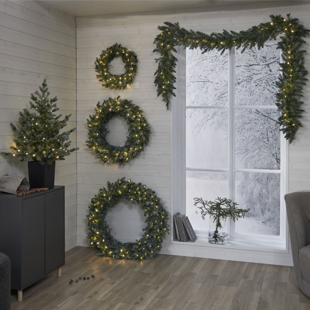 I samma familj finns även granar, fler storlekar på kransar och en girlang.