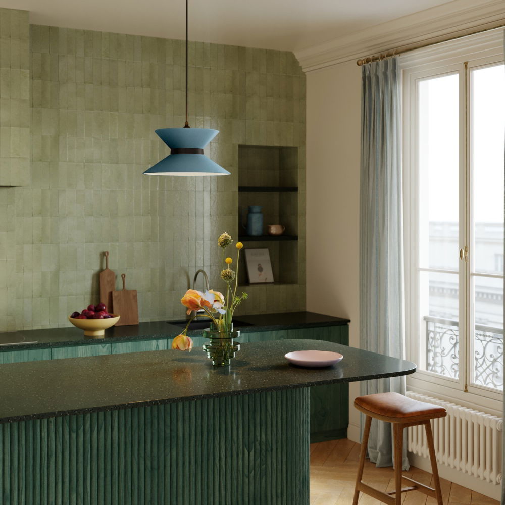 Ge din pendellampa en elegant uppgradering med Clessidra, en timglasformad lampskärm i textil med mjuka, neutrala toner.