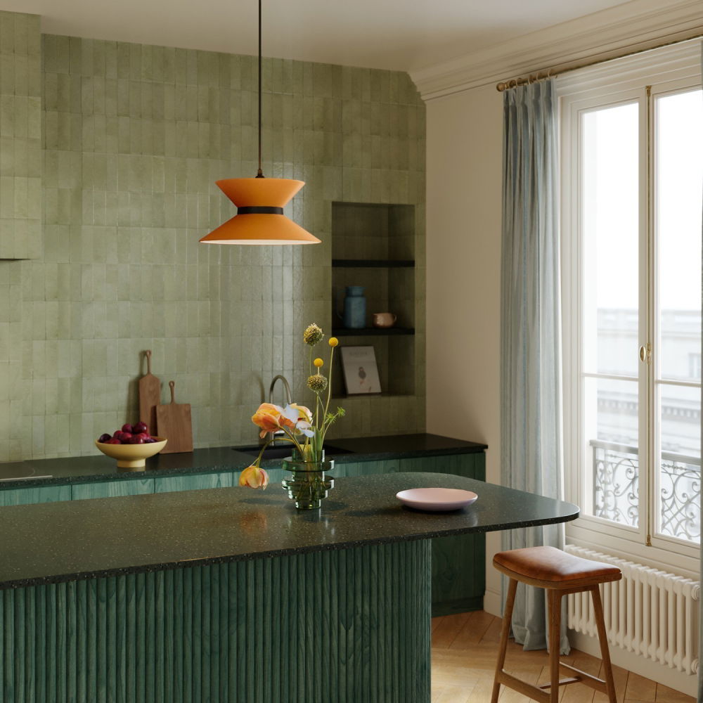 Ge din pendellampa en elegant uppgradering med Clessidra, en timglasformad lampskärm i textil med mjuka, neutrala toner.