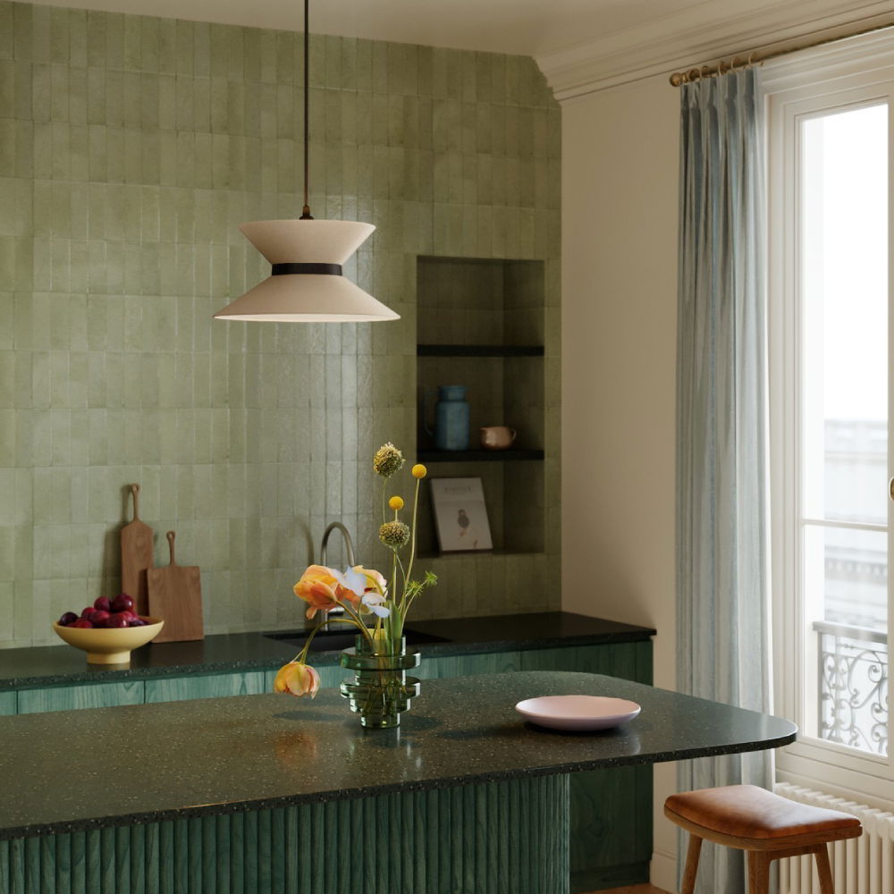 Ge din pendellampa en elegant uppgradering med Clessidra, en timglasformad lampskärm i textil med mjuka, neutrala toner.