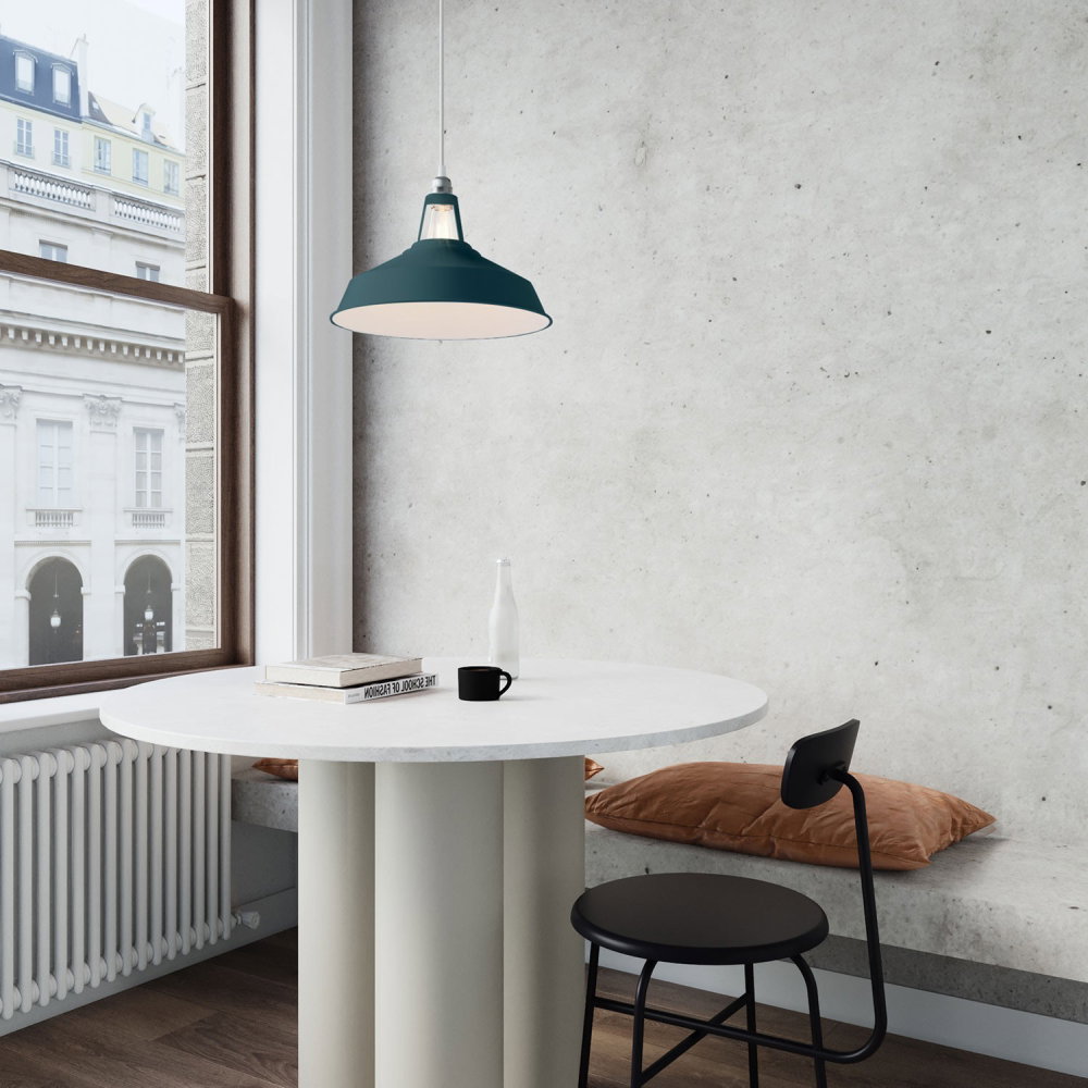 Lampskärmen Harbour i emaljerad metall petrol för E27-sockel är det perfekta valet för dig som vill ha en belysning med originell och naturlig känsla.