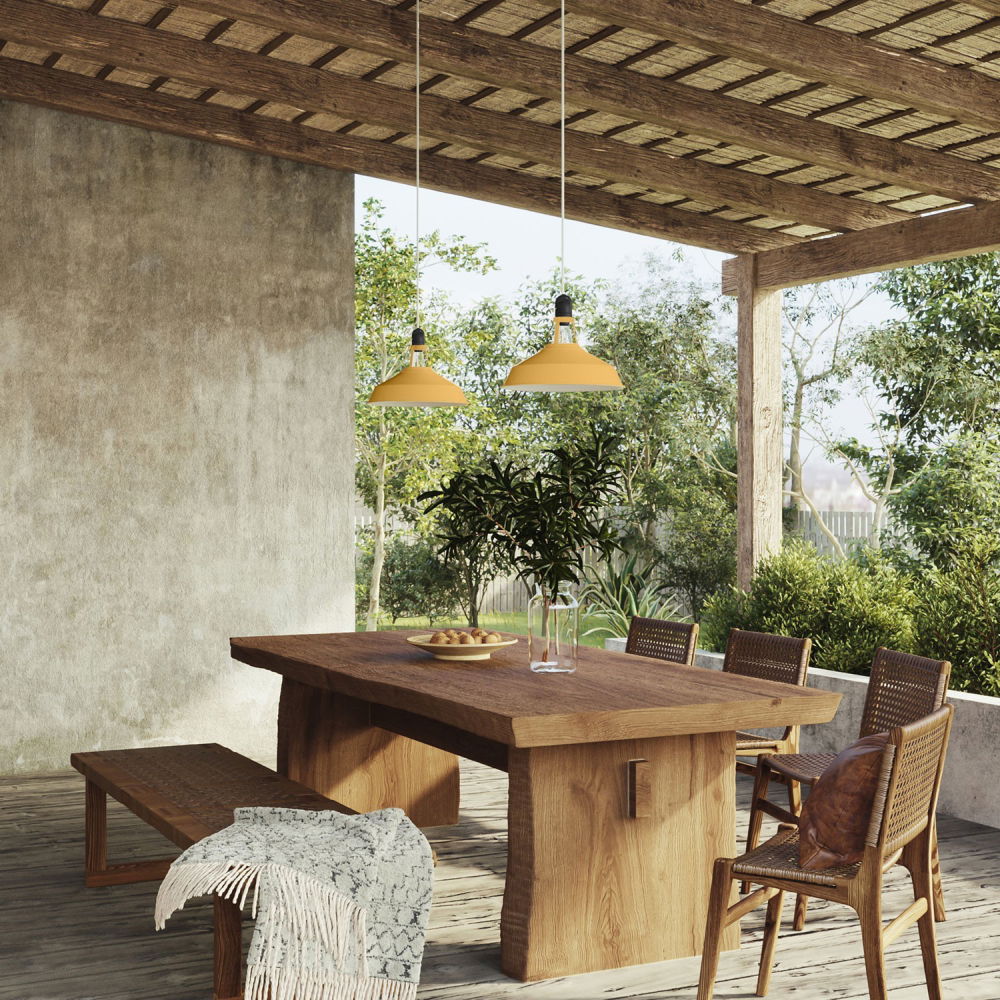 Den moderna designen på lampskärmen, kombinerad med den intensiva senapsgula färgen, gör den perfekt för kök med vintagestil, kreativa vardagsrum och verandor med eklektisk stil.