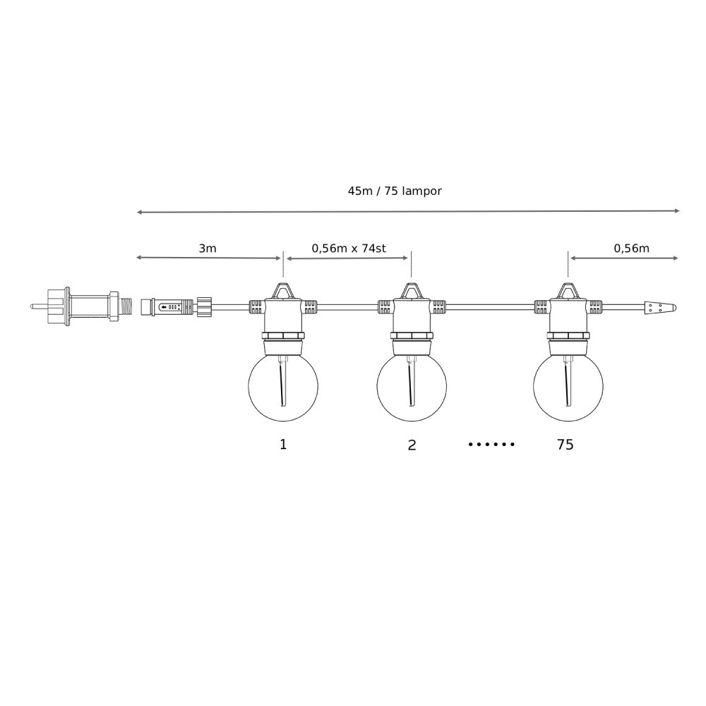 Denna 45 meter långa ljusslinga är designad för utomhusbruk och har 75 jämnt fördelade LED lampor med en vattenklassning IP54