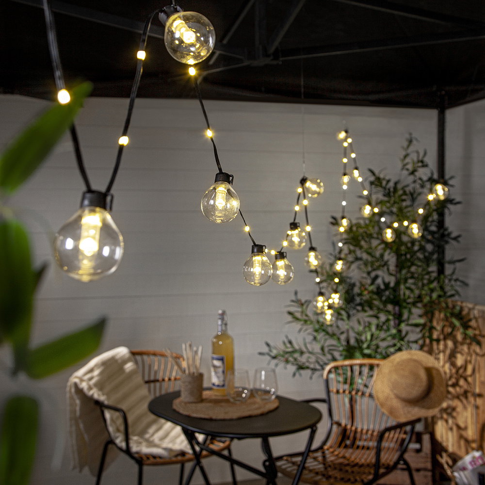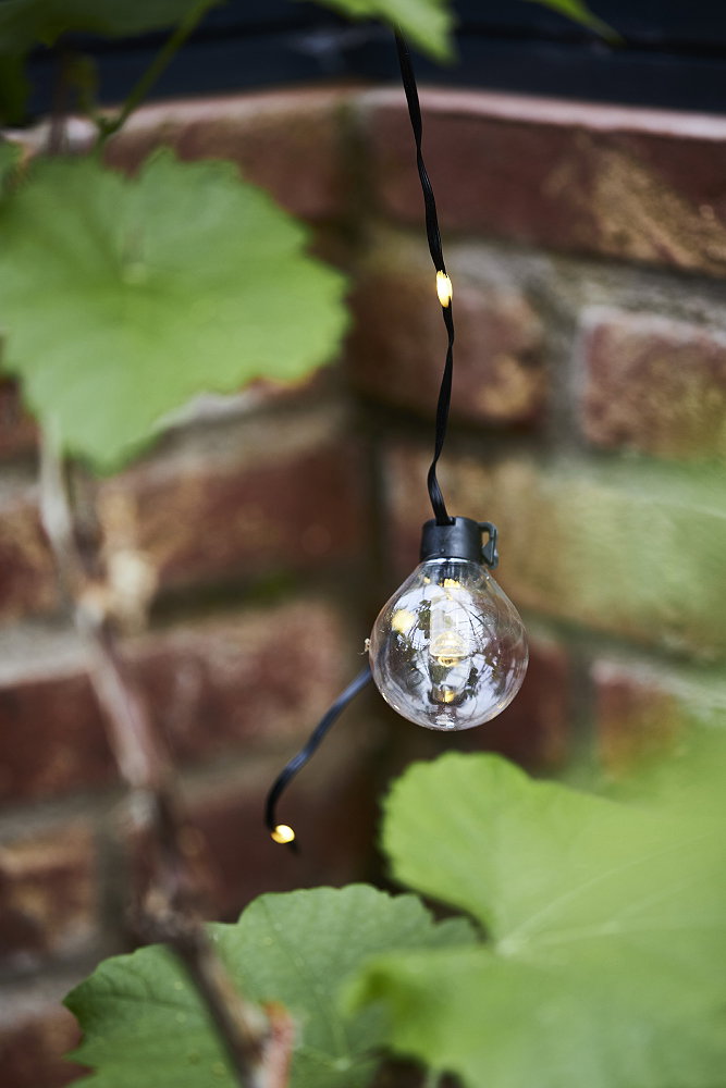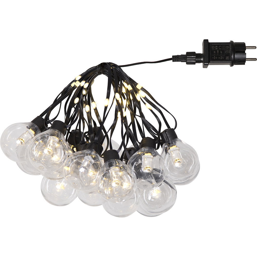 Ljusslinga för utomhusbruk med 20 st klara glober. Mellan varje glob finns ytterligare 2 ljuspunkter på kabeln.