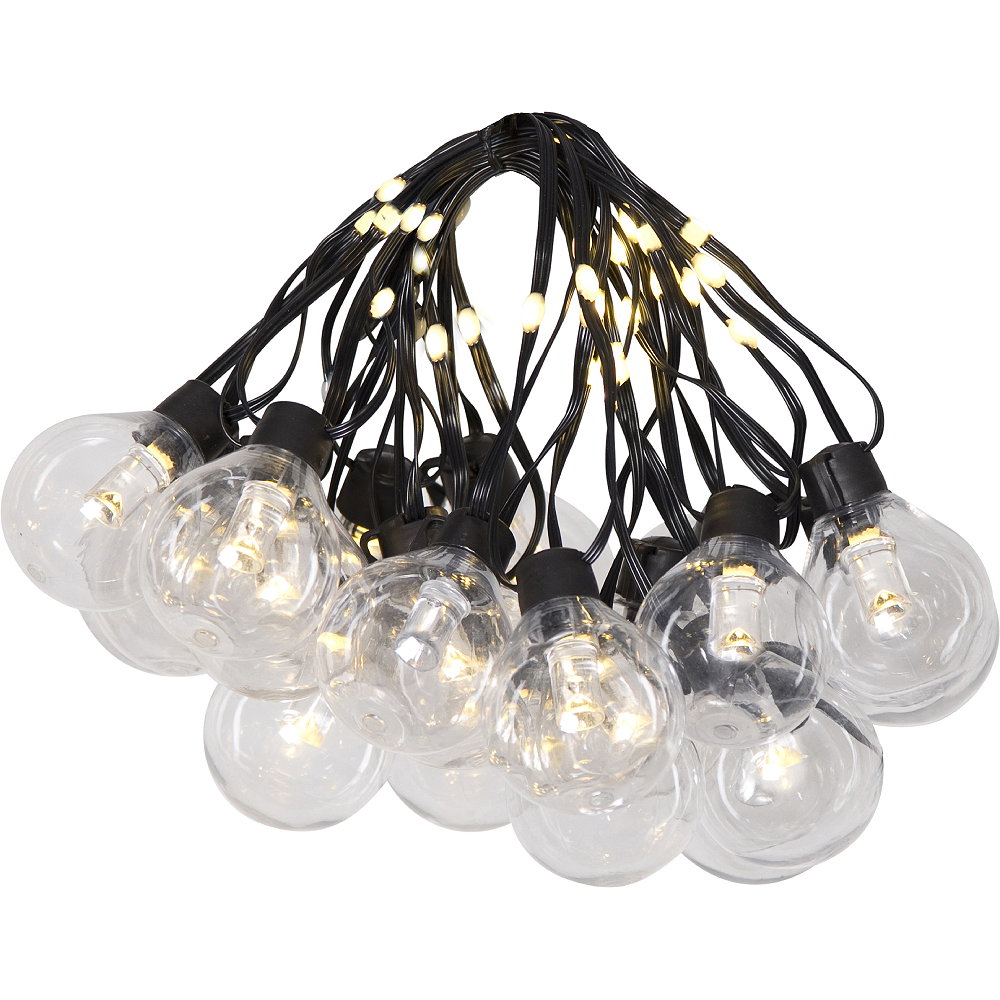 Ljusslinga för utomhusbruk med 20 st klara glober som är 4 cm i diameter. Mellan varje glob finns ytterligare 2 ljuspunkter på kabeln, samtliga ljuspunkter med varmvitt sken.